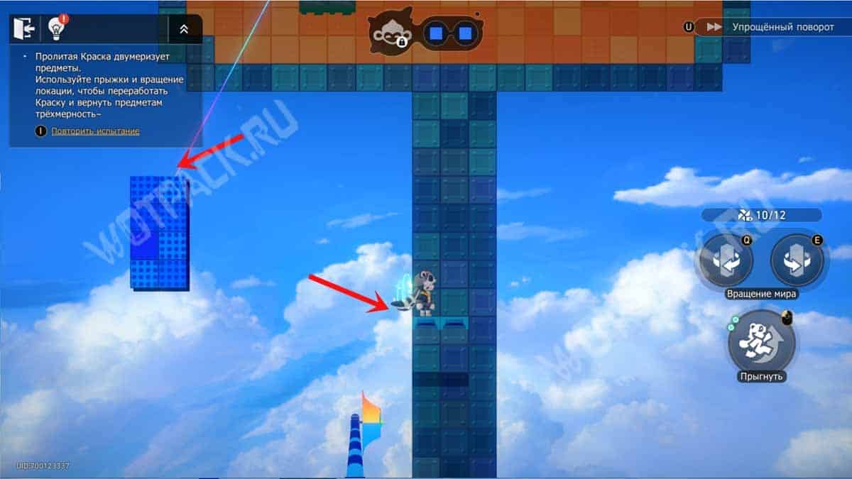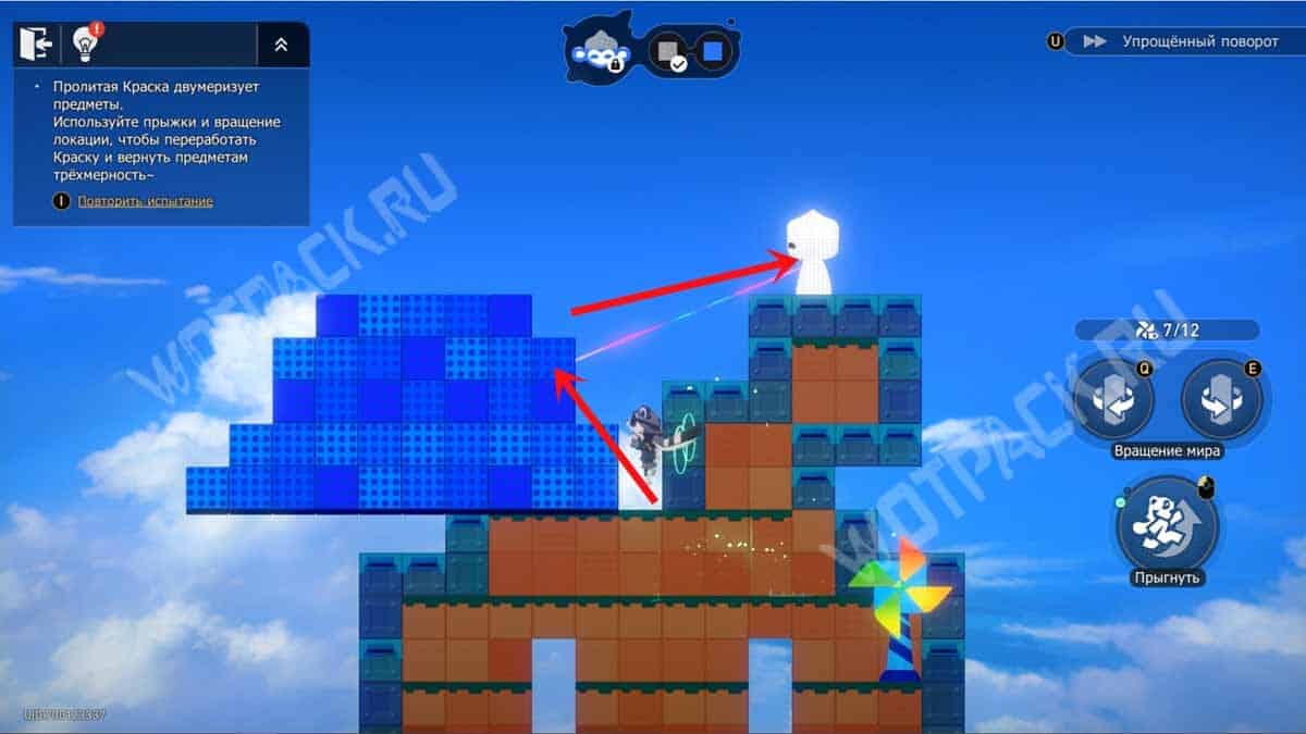 С образованной платформы запрыгните на верхнюю зону, соберите краску со скопления синего цвета, после чего раскрасьте обезьянку для завершения испытания.