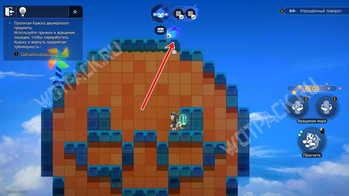 Заберитесь на основной остров, выполните два поворота в любую сторону , чтобы синяя масса оказалась над платформой. Пройдите под краской, спустившись на нижний ярус через «вниз + прыжок», а затем заберитесь сбоку для взаимодействия с объектом. После этого сможете активировать обезьяну и забрать награду.