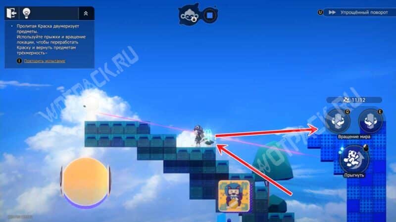 Нажмите поворот вправо один раз, сделав полумесяц, повернутый в левую сторону. С него перепрыгните на синий объект, соберите краску, а затем получите награды у зверушки.