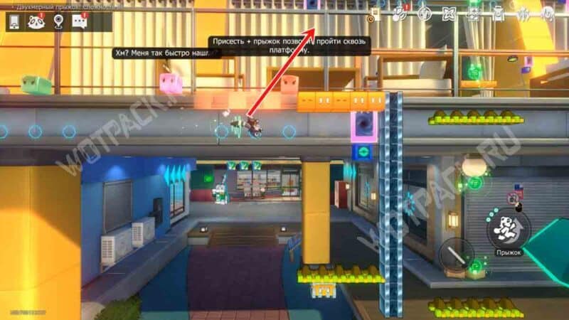 На локации с двойником наведите его на фиолетовую платформу, чтобы он запрыгнул на синий прямоугольник. Перемещать голубые квадратики можно, наступив на желтую кнопку рядом со стенкой. Когда двойник переместится в левую сторону, совершите прыжок в подходящем направлении и схватите жулика.