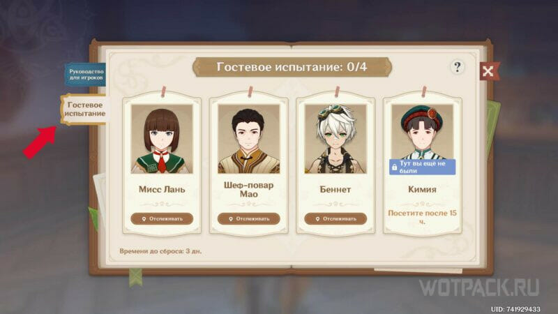Каждую новую неделю в таверне становится доступно 4 различных НПС для гостевого испытания. Отследить их появление можно во вкладке “Гостевое испытание” в Руководстве для игроков, иконка которого находится в правом верхнем углу экрана. Для игроков, еще не достигших 4 уровня игрока, соперники открываются по одному каждый день (с понедельника по четверг). Игроки 4 игрового уровня и выше могут сразиться со всеми гостями в первый же день.