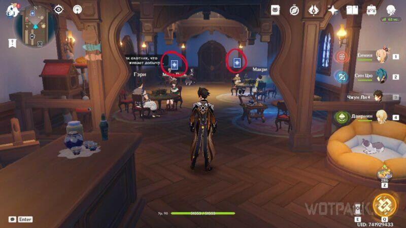 НПС, доступные для гостевого испытания, отмечены иконкой карты над именем. Игроки могут располагаться в основном зале таверны, а также сидеть в отдельных дуэльных залах. Начните диалог с НПС, чтобы запустить испытание и сразиться в карточном поединке.