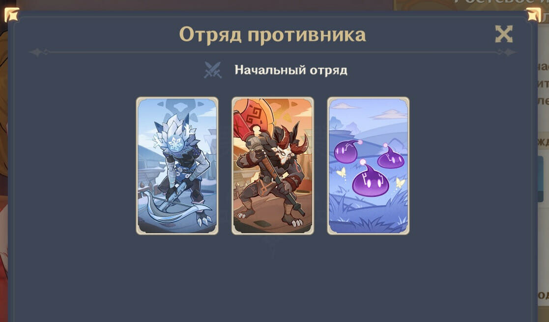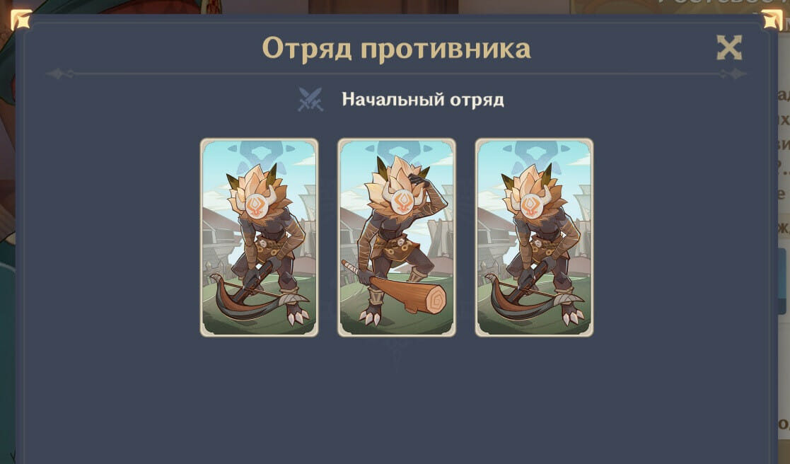 У этого НПС очень простая колода, состоящая только из 3 хиличурлов-стрелков. Они являются обычными и не могут накладывать статус какой-либо стихии, поэтому не беспокойтесь о том, что бой будет сложный и с большим количеством элементальных реакций. Количество здоровья у врагов небольшое, но различается: у центрального монстра 4 HP, а у крайних по 3.