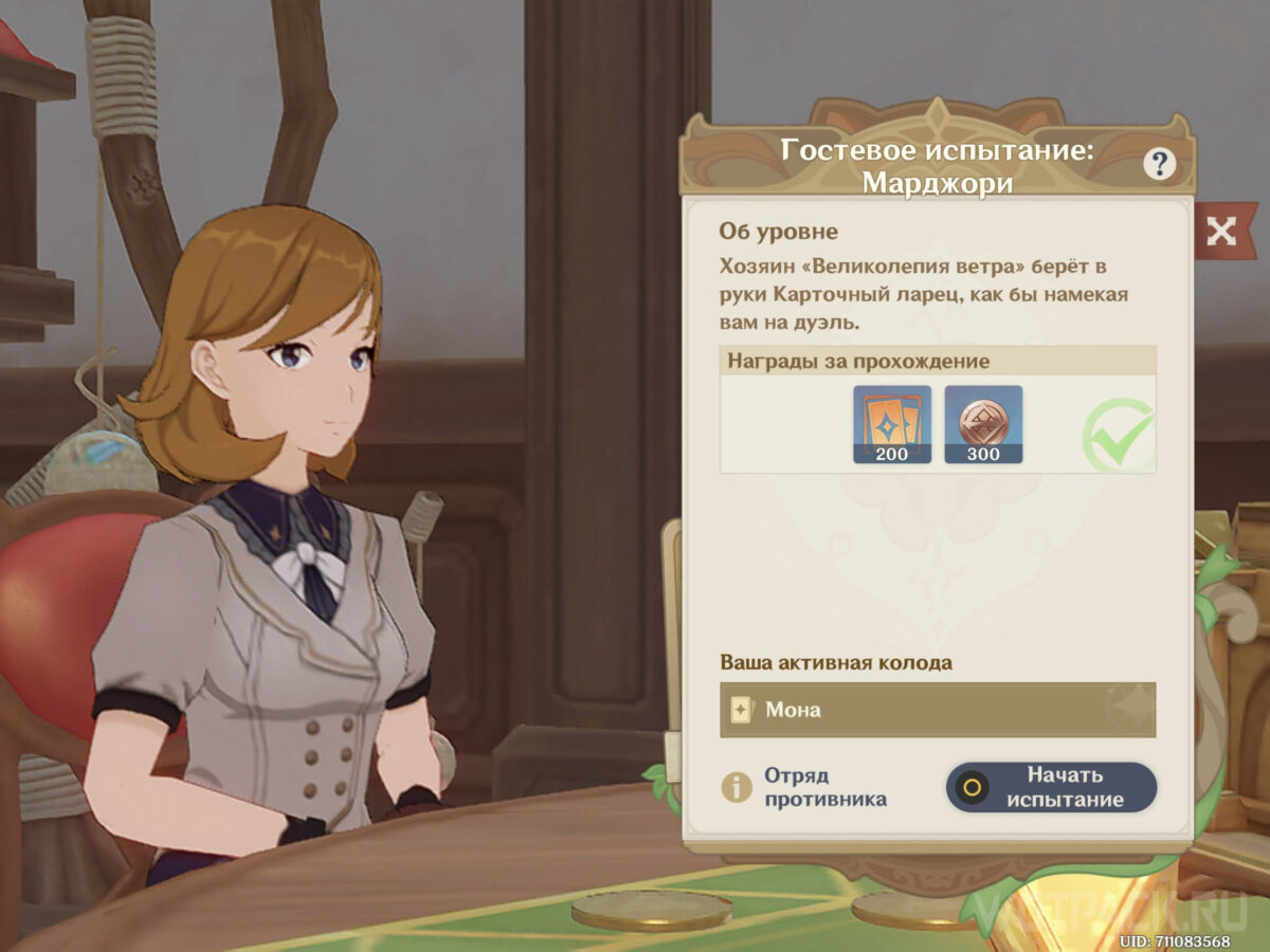 У торговки колода состоит из простых монстров: Митачурлы с огненным топором и ледяным щитом. Дуэль не столько сложная, сколько требующая определенной команды: митачурл с ледяным щитом в начале игре имеет щит и Крио статус, которые снижают получаемый урон на 2 ед. Чтобы снять щит, нужно 2 раза вызвать элементальную реакцию.