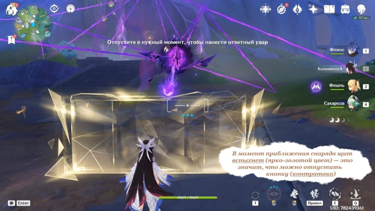 - Когда барьер вспыхнет, отпустите кнопку, что приведёт к контрудару.