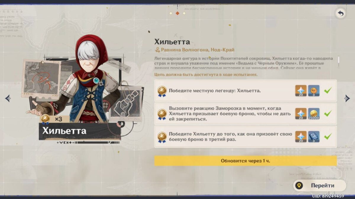 Выполните уникальные цели вызова в Геншин Импакт и несколько раз победите бабушку Хильетту, чтобы разблокировать дополнительные призы от Гильдии искателей приключений: