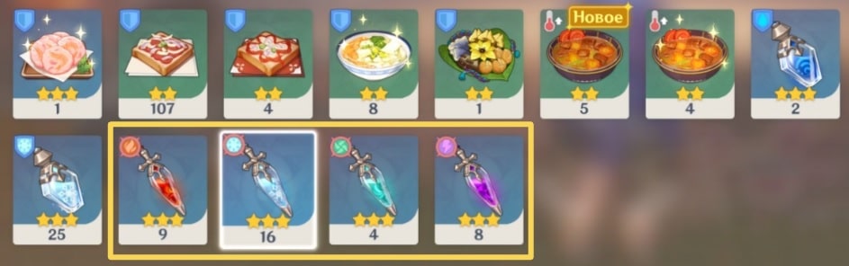 - Если ощущаете нехватку в дамаге, используйте еду, увеличивающую важные боевые характеристики (АТК/HP/защита, шанс крит. попадания и другое). Также примените масло, дающее прирост к элементалке. Эффекты от расходников будут работать, так как сражаетесь в открытом мире.
