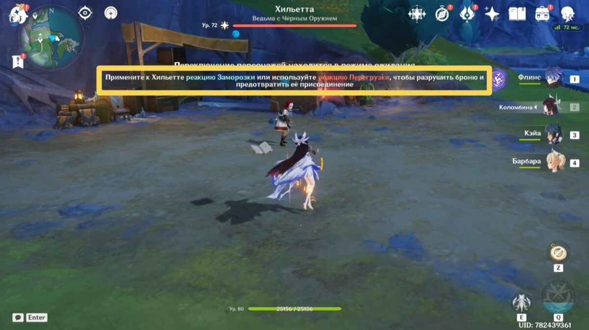 Для выполнения второй задачи Гильдии придётся использовать соответствующую команду — связку Гидро и Крио персонажей. Когда противница встанет в центр поля, а на экране появится уведомление:
