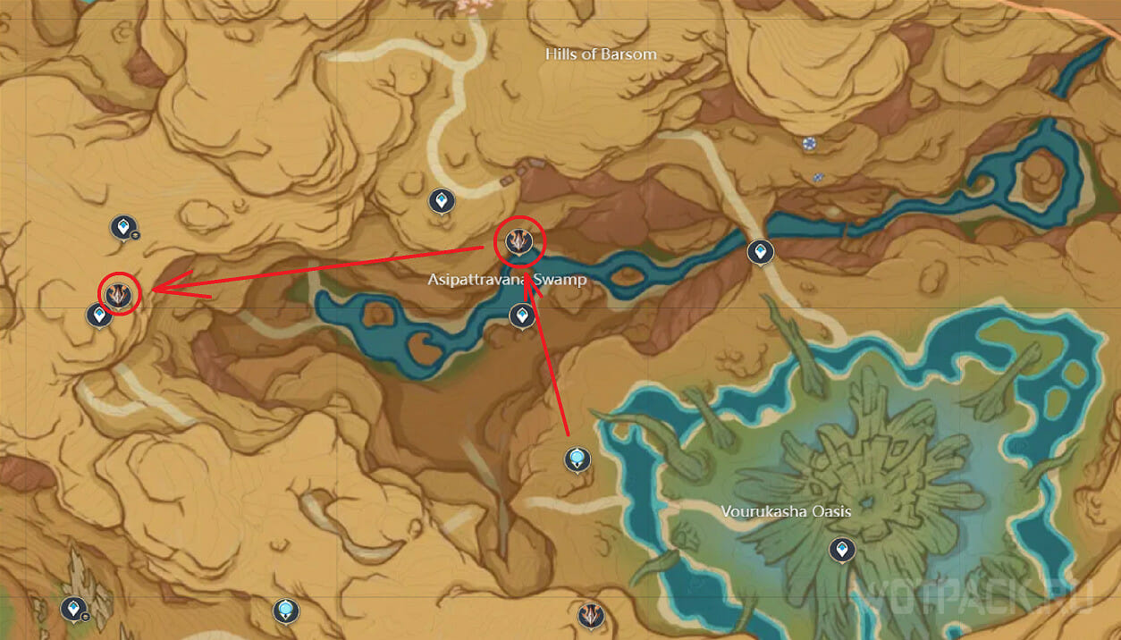 У болота Асипаттравана есть две точки поблизости. Первая находится на севере от Дендро Статуи Архонта. Достаточно пройти к тропе, ведущей в пещеру. Найдя крокодила, сможете одолеть его и двигаться дальше.