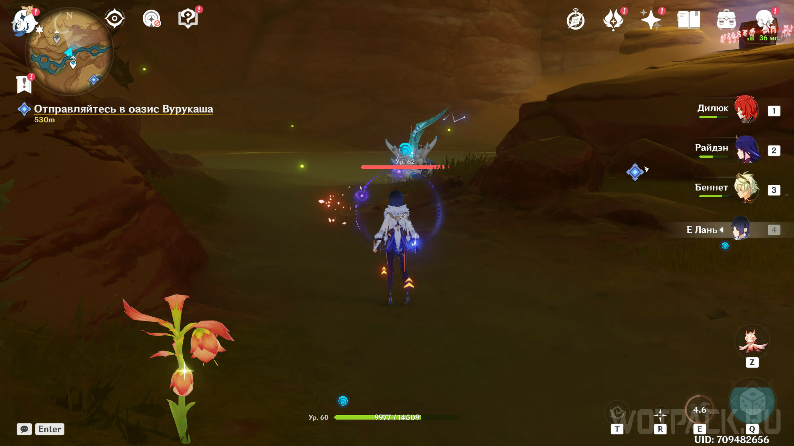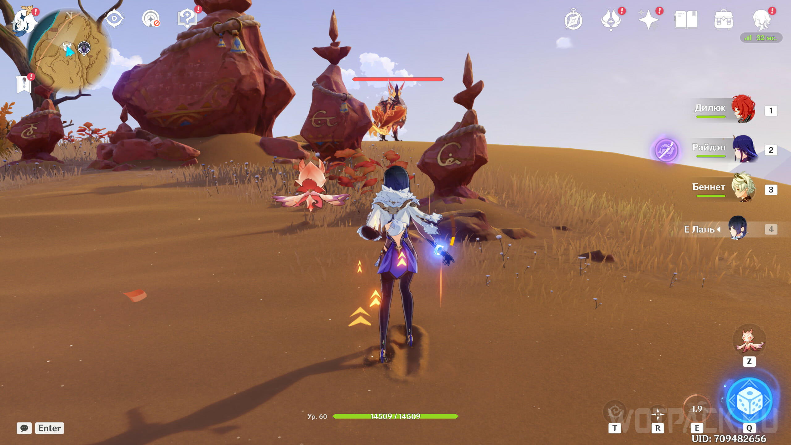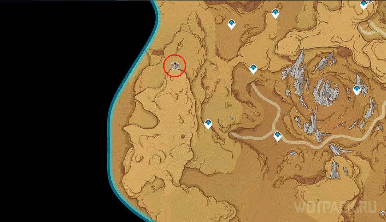 В Стальных дюнах есть одно место, где удастся встретить Священного стервятника. Переместитесь к телепорту, расположенному на границе с Сумеру, от него двигайтесь на запад, а затем на север: нужно попасть на небольшое плато, заточенное в кольце из камня. Там и найдете врагов, а также богатый сундук.