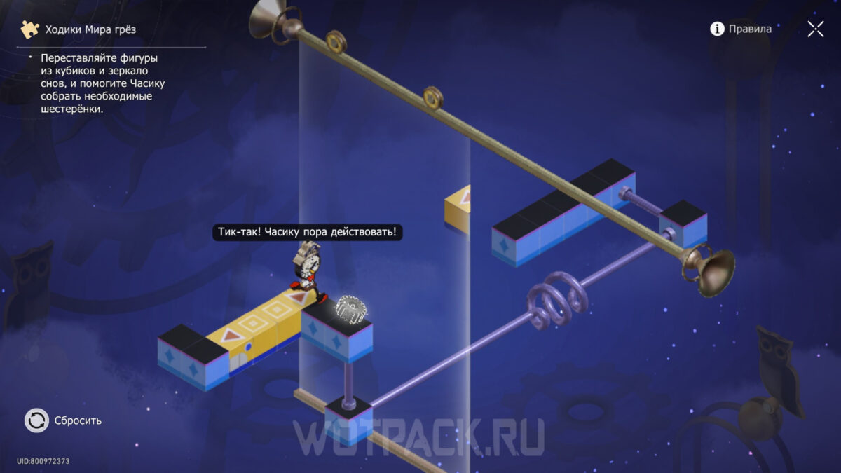 Сдвиньте зеркало снов на несколько шагов влево и разверните центральные голубые кубики так, чтобы их длинный конец не стоял на пути Часика.