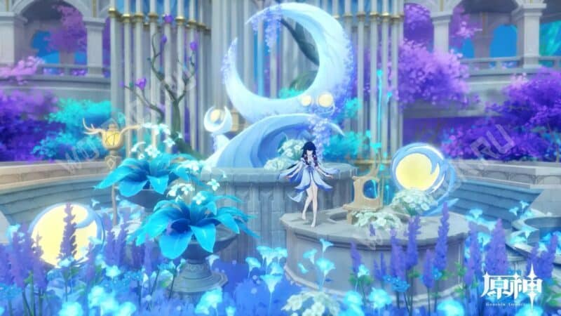 Пруд и изящная часовня с сердцем. Оформление светящимися цветами Инадзумы и Сумеру подходит для любования пейзажами.