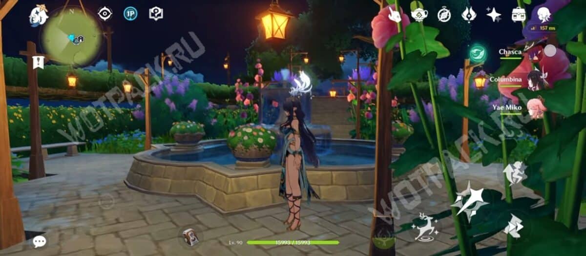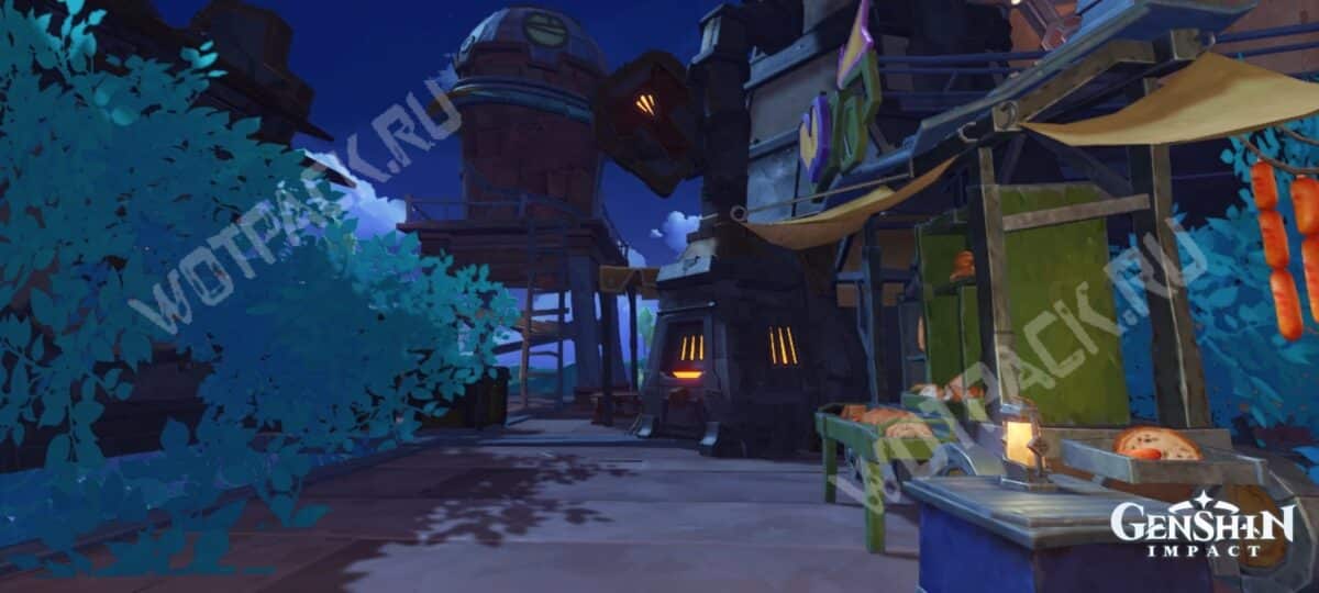 Уголок Инадзумы на летних островах прекрасен как в лучах солнца, так и под луной. Светящиеся растения прекрасно обрамляют живописный уголок у бассейна.