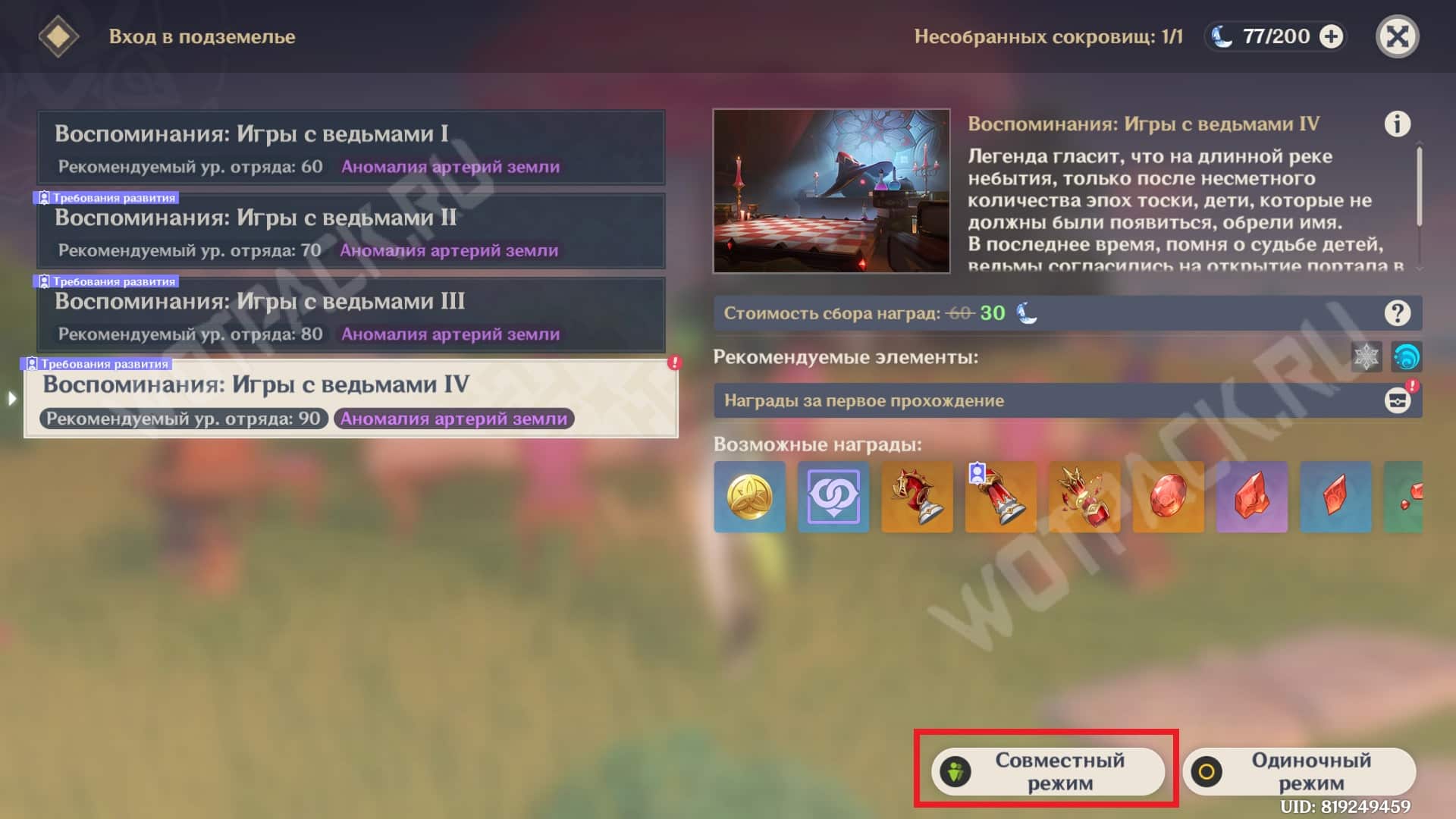 Вход в подземелье «Недоигранная партия в шахматы» расположен на Побережье сокола, у восточного берега Мондштадта. Чтобы попасть к боссу, предстоит пройти основную сюжетную главу «Паралогизм» или воспользоваться функцией Быстрого старта (доступно для аккаунтов с 45+ рангом приключений). Внутри есть четыре уровня сложности: «Игры с ведьмами I, II, III, IV».