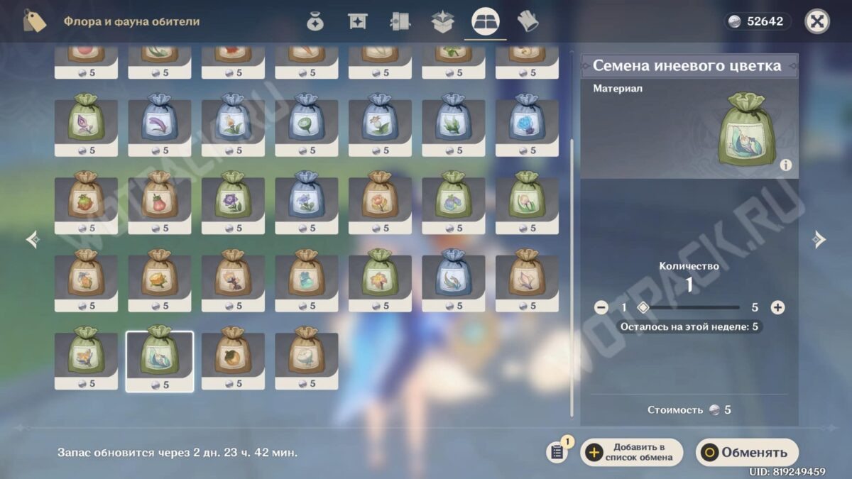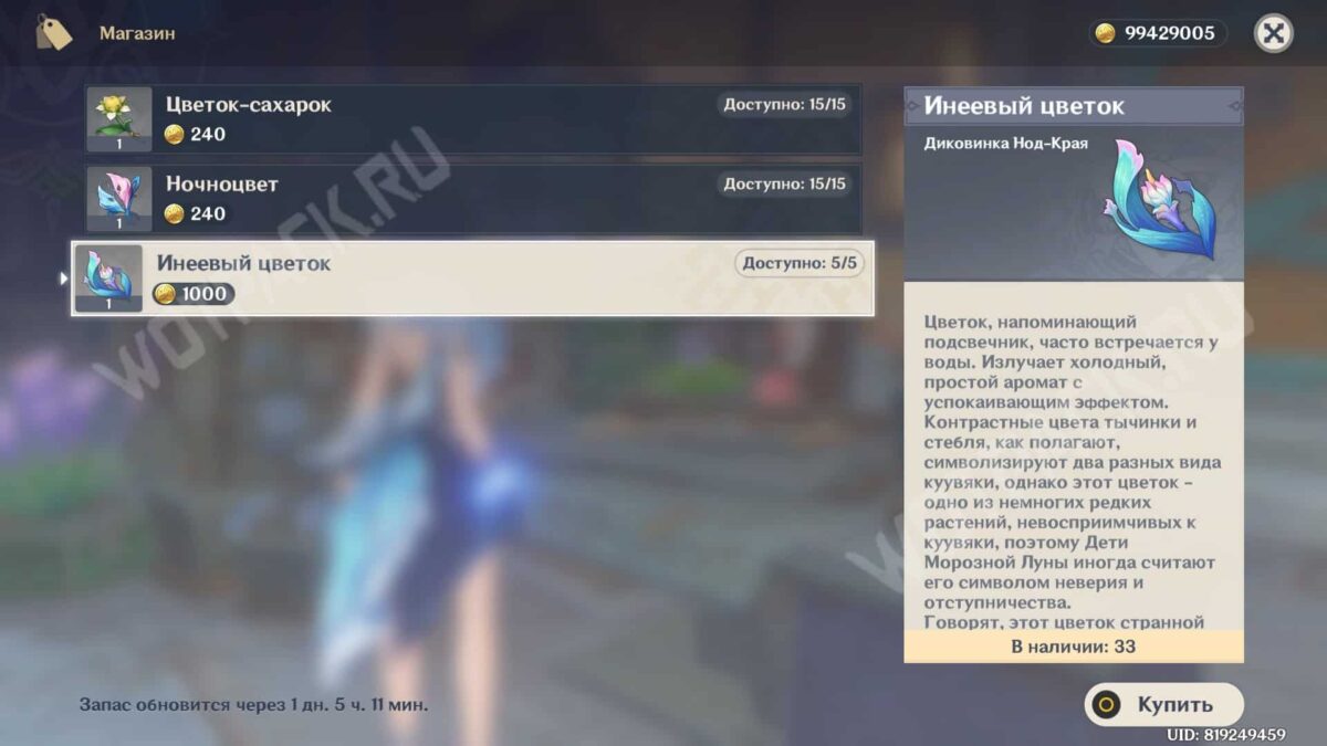 Помимо инеевого цветка в количестве пяти штук, на покупку которых суммарно уйдет 5000 моры, сможете приобрести цветок-сахарок и ночноцвет.
