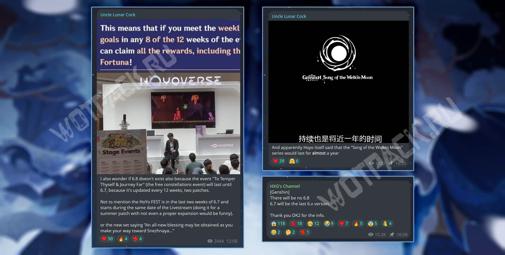 - Uncle Cock заметил, что текущий сезон ивента Долгий путь совершенства (с бесплатными созвездиями) закончится 10 августа под конец обновления 6.7. Кроме того, масштабный HoYo FEST 2026 начнётся 31 июля, что совпадает с проведением стрима по следующей версии. В такую важную дату будет символично анонсировать не летний праздник, а Снежную.