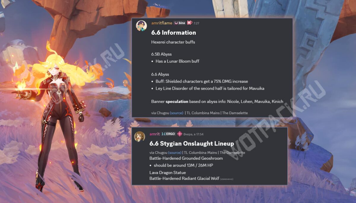 По его словам, в Мрачном натиске ожидаются Статуя лавового дракона, Тоскующий по родине волк-одиночка и Бывалый земляной Гео моровик. Последний враг — это новая местная легенда из 6.5, шкала которого заполняется Дендро уроном. В Витой Бездне усилят героев под щитами и во второй фазе есть бафф под Мавуику. Учитывая это, в версии 6.6 могут быть такие баннеры: