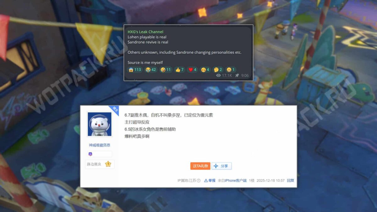 Уже некоторое время распространяются слухи о том, что Предвестница Сандроне погибнет в событиях Луны 4, но позже её воскресят. Инсайдер hxg_diluc сказал, что и это правда, однако он ничего не знает относительно следующих заявлений 神威难藏舅, поэтому относитесь к ним как к сомнительным: