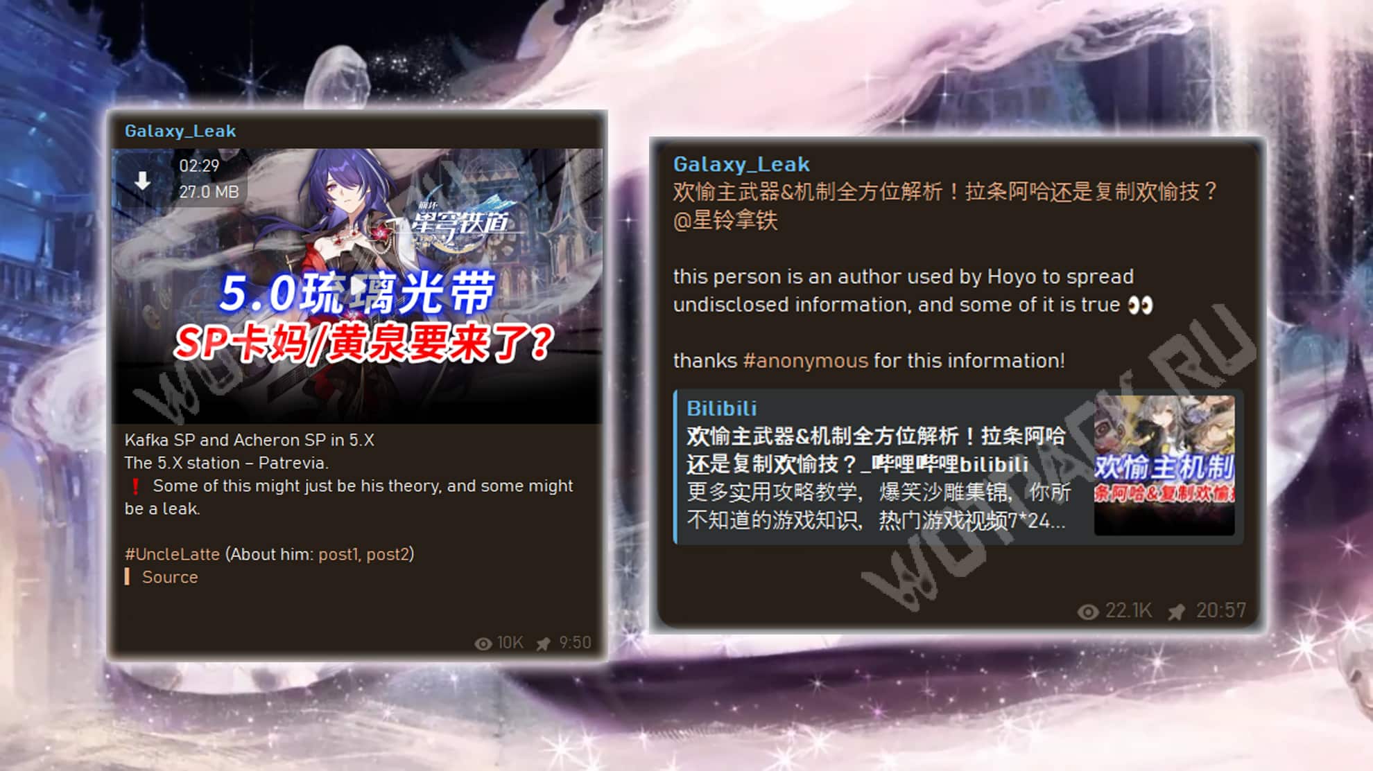 Информация поступила от анонима под ником Uncle Latte. Ранее на него дважды ссылался Galaxy, назвав его «человеком, через которого HoYoverse распространяют некоторые достоверные факты». Этот инсайдер выложил в китайской соцсети Bilibili несколько видео с теориями и предположениями, касающимися арки обновлений 5.X.
