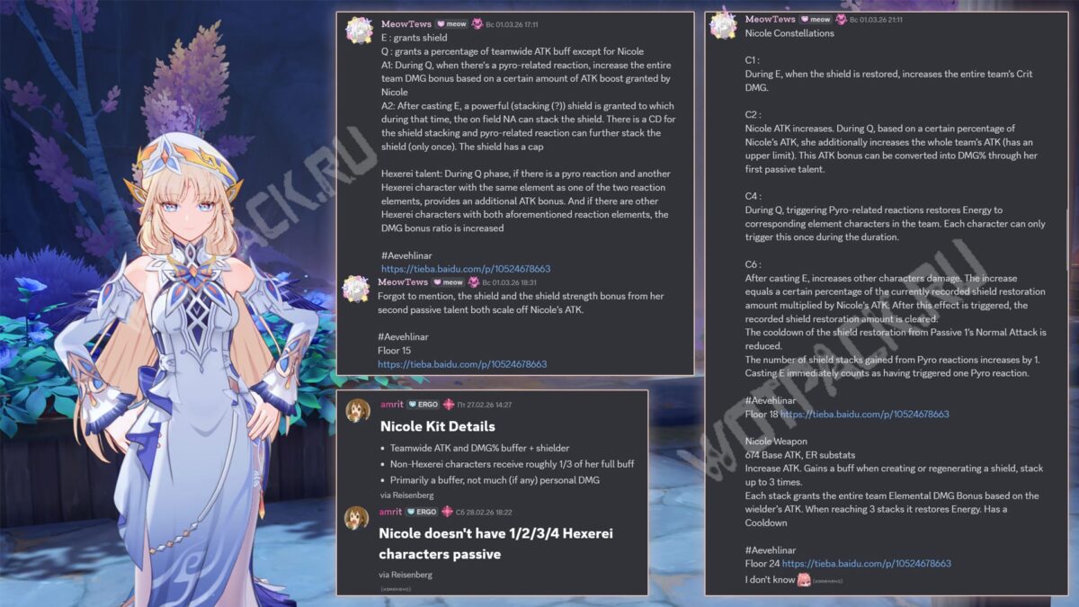 - Николь — Пиро щитовик, а также баффер АТК и урона. Личного дамага у неё особо нет (если он вообще есть).