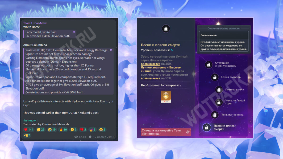 - Артефакты на Коломбину повышают урон Лунных реакций. Сет для участников Ведьминого шабаша баффает криты и силу атаки.