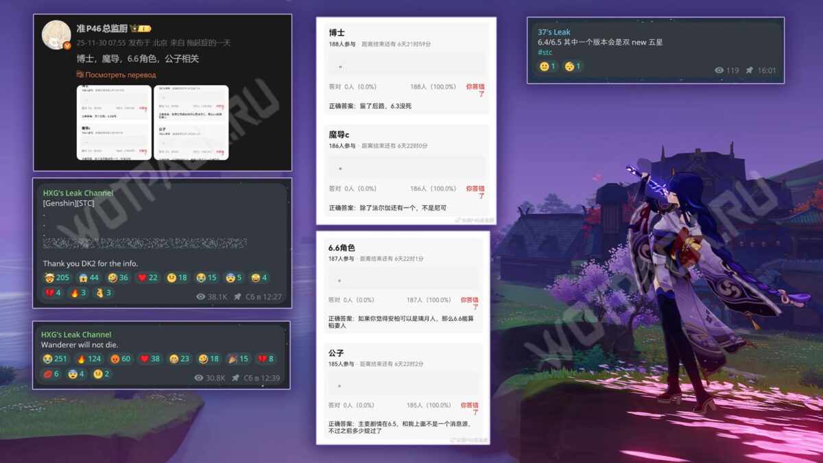 Также на китайской платформе weibo опубликовали инсайд от 豆友275588263 про то, что в версии 6.6 ожидается герой, родственники которого родом из Инадзумы. Может быть речь идёт о том самом юноше, владеющем катаной и знающего Странника, Итто и Кадзуху, о котором стало известно от 剧情. Кроме того, помимо Николь и Варки, запланирован ещё один ведьмовской персонаж.
