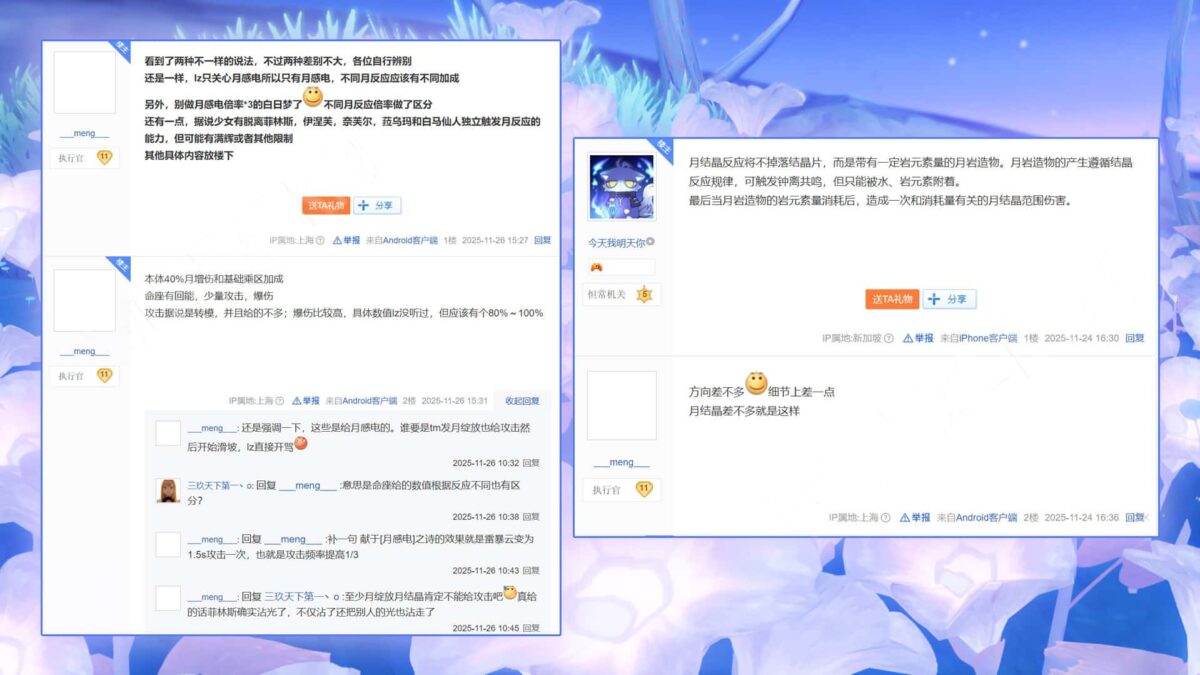 На китайской платформе tieba вновь появились утечки о способностях Коломбины (Гидро, катализатор) от пользователя meng. На них обращают внимание, поскольку именно от него поступила первая верная информация о драконе Дурине. Источник поделился парой версий её баффов для связки с Электро стихией в Genshin Impact, и первая из них была выделена как более вероятная: