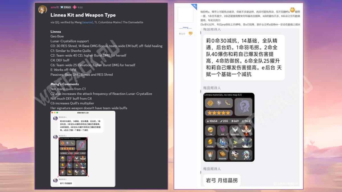 На китайском форуме tieba подтвердили часть слухов по Genshin Impact от пользователей 少废话 и 你DPS多少. Надёжный инсайдер meng прокомментировал пост от 梅宜阁诗人 с платформы QQ и добавил свои комментарии по поводу способностей Линнеи, релиз которой должен состояться в обновлении 6.5. Перевод на английский выполнили Columbina Mains.