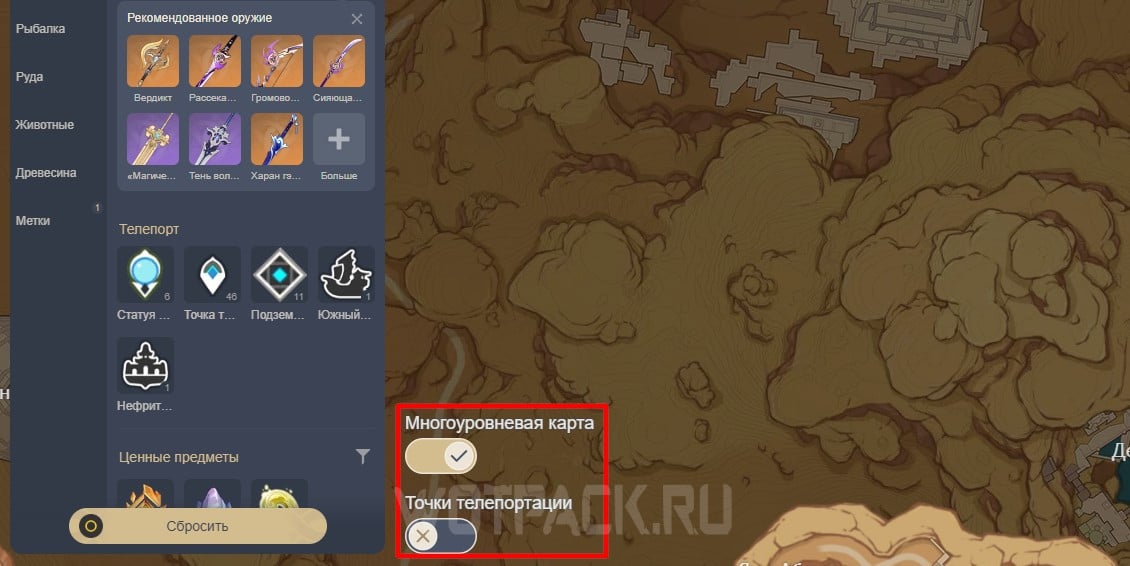 Меню со всеми основными метками, в числе которых находятся сундуки, телепорты и многое другое, расположено в левом верхнем углу. Все маркеры отсортированы по общим категориям для более удобной навигации. Кроме того, пользуясь строкой поиска, удастся быстро найти конкретный предмет, локацию или врага.