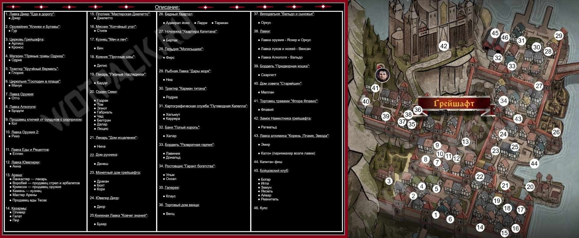 Простой по дизайну, но не менее информативный путеводитель с разделением на области. Благодаря этому удобно определять районы Грейшафта, которые иногда упоминаются в качестве загадок в квестах. Автор указал оригинальные названия заведений и персонажей, доступных для взаимодействия.
