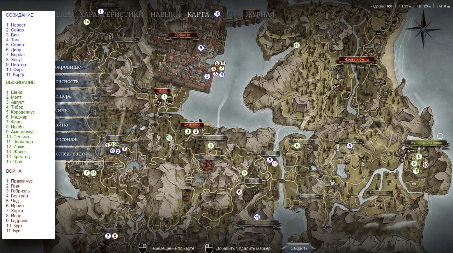 В этом случае стоит воспользоваться путеводителем с местоположением учителей. За основу взят оригинальный набросок Грейшафта, где цветными числами отмечены точки с необходимыми НПС. Слева найдете список тренеров и разделы талантов, которым они обучают.
