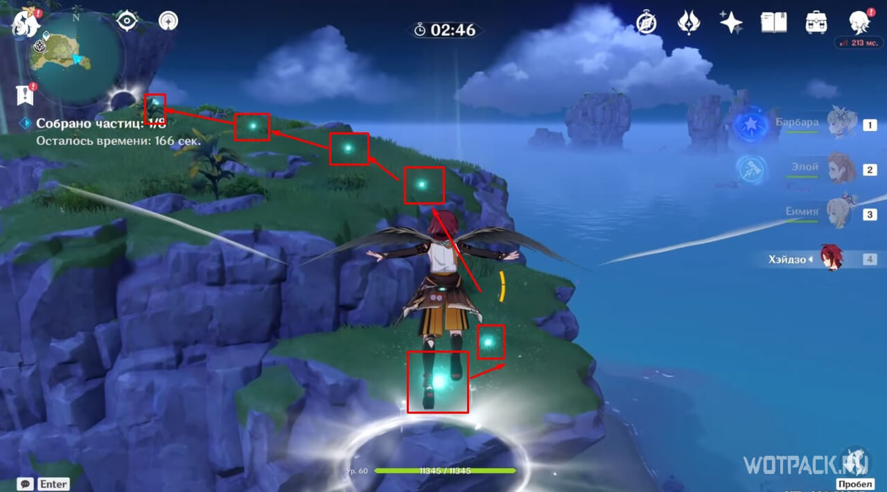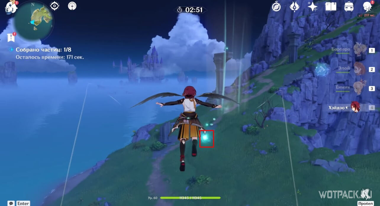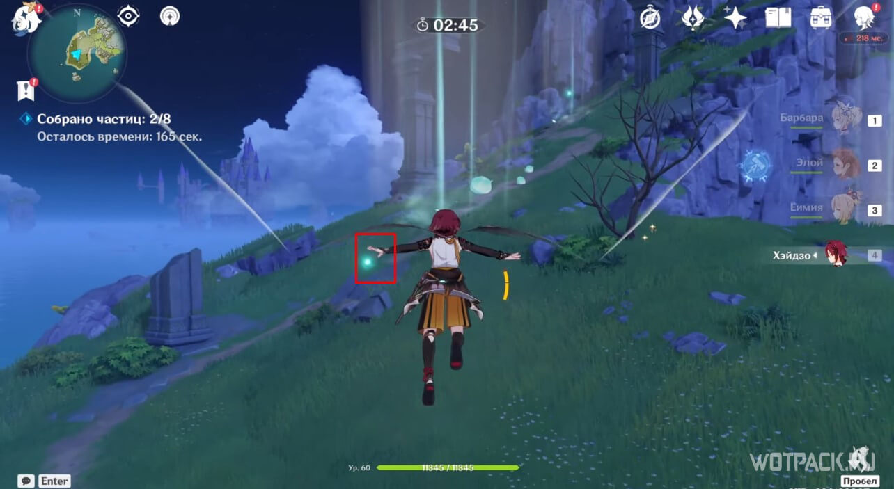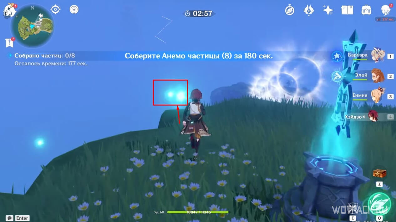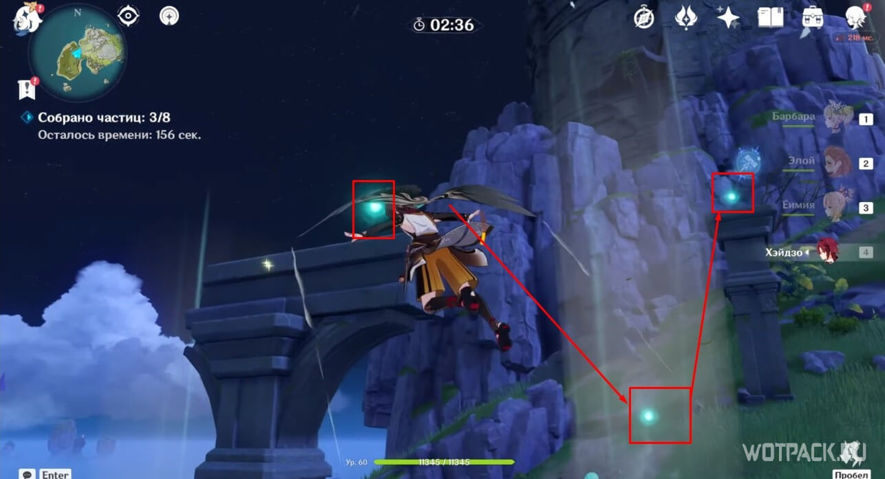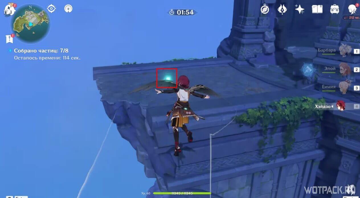 Подберите первую Анемо частицу, а затем активируйте мельничный механизм, стоящий рядом с ней. Поднимитесь по ветряному потоку, а после пикируйте ко второй частичке.