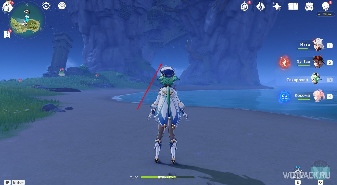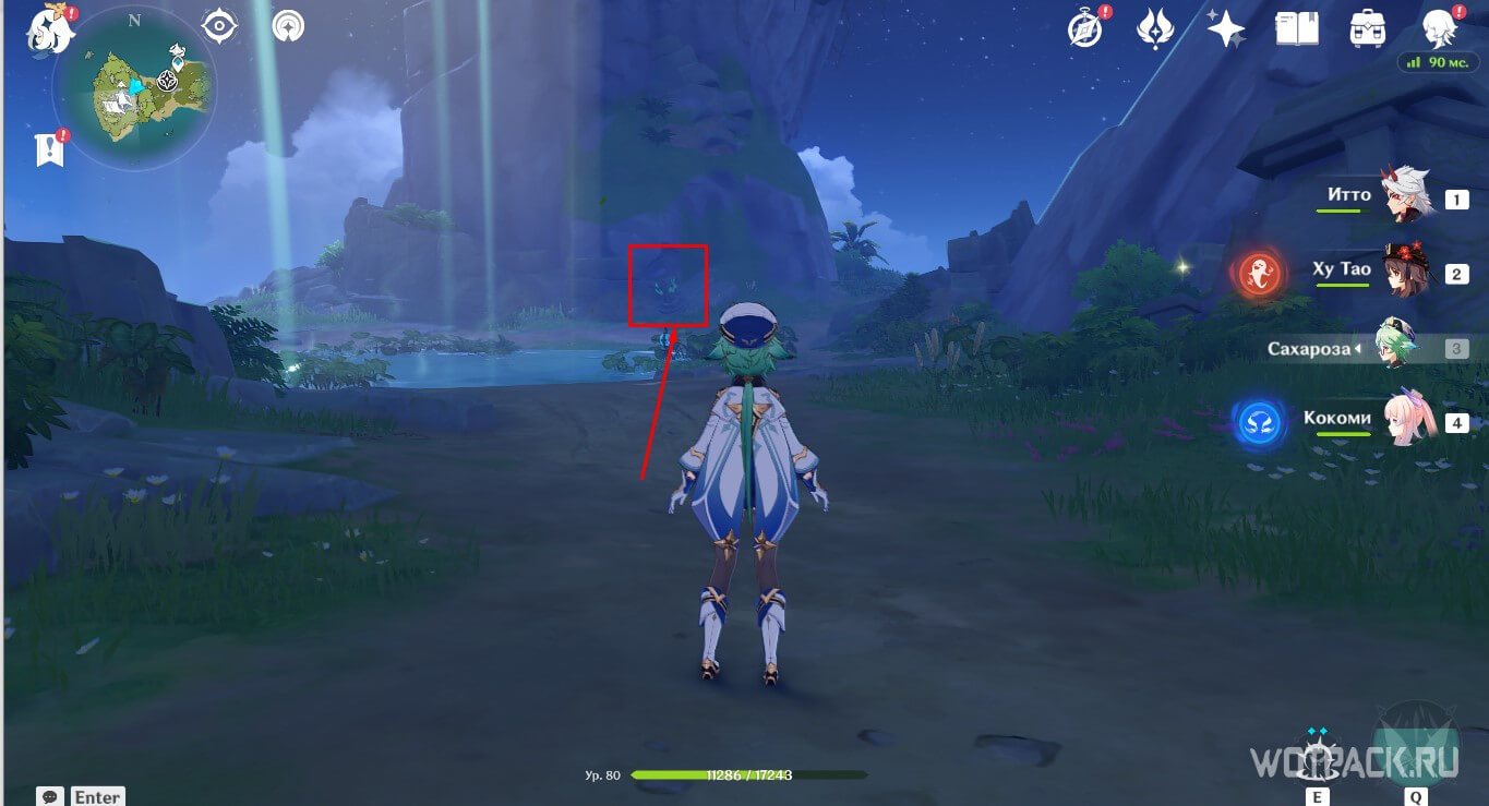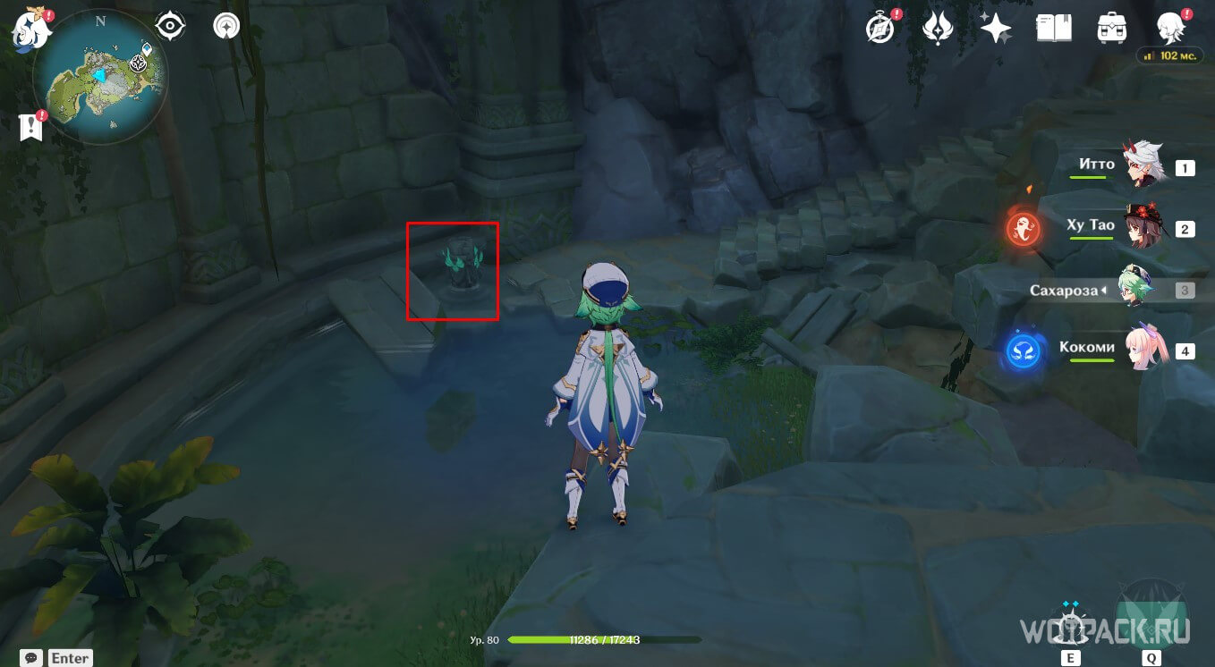 Измените остров, а затем переместитесь на ту же точку телепортации. Пройдите в пространство под горами и зажгите Анемо тотем, стоящий возле небольшого водоема.