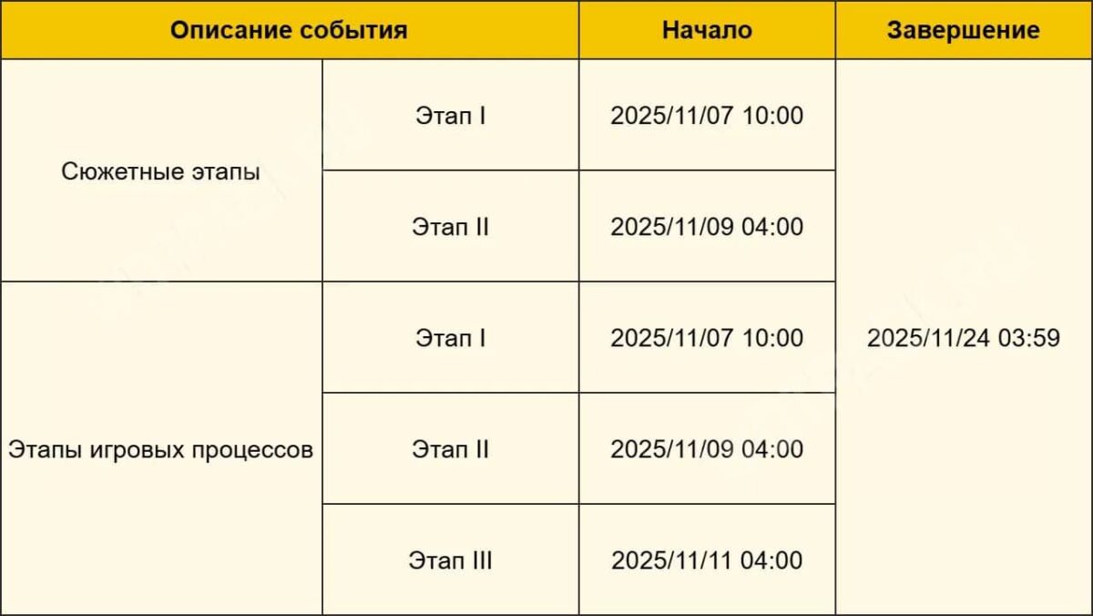Ивент начинается во второй половине обновления, и длится с 7 до 24 ноября 2025 года. Новые мини-игры запускаются раз в три дня, а сюжетных заданий всего два и они открываются через день.