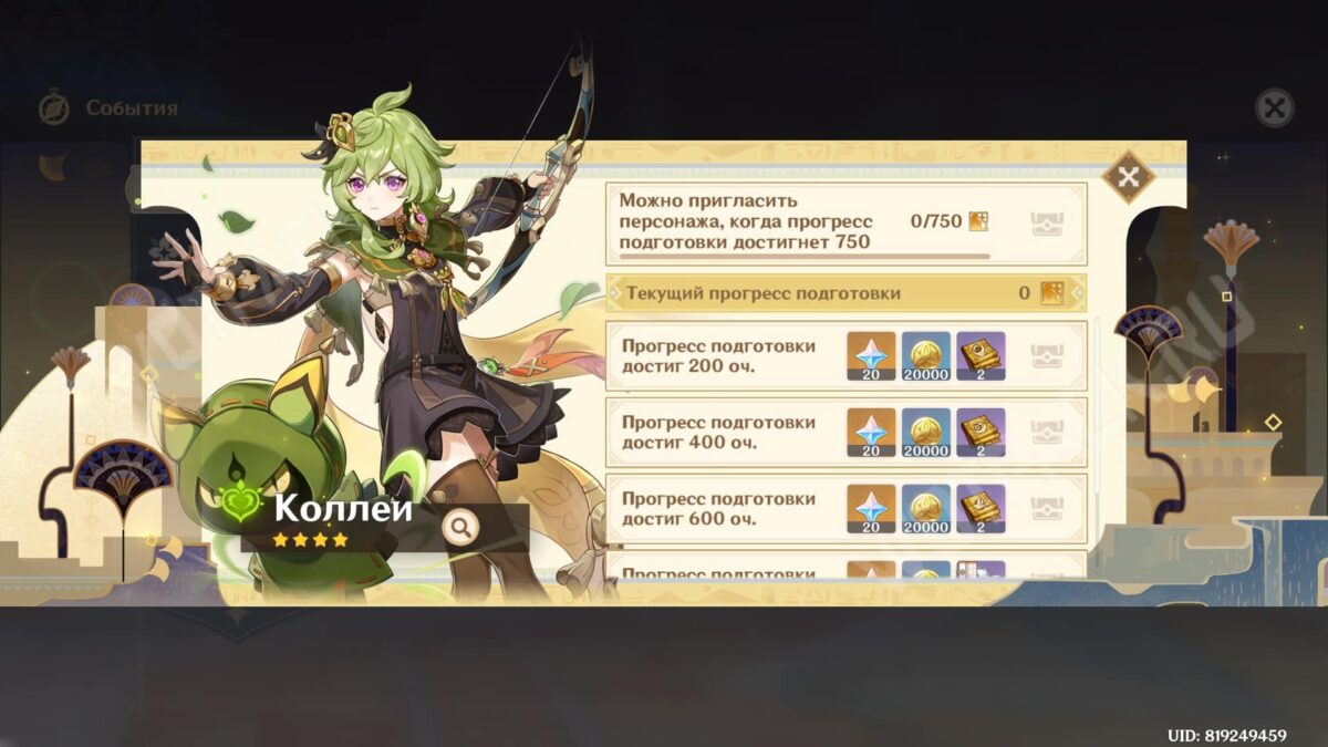 Среди призов события присутствует приглашение 4⭐ персонажа, Коллеи (Дендро, лук). Она станет доступна после достижения прогресса подготовки в 750 ед.