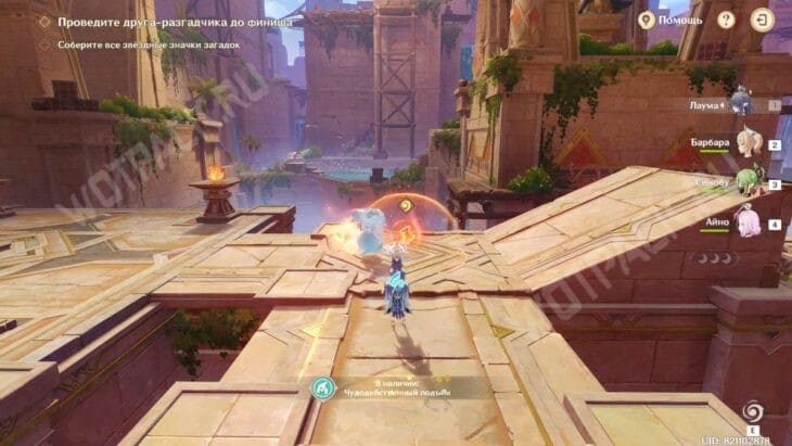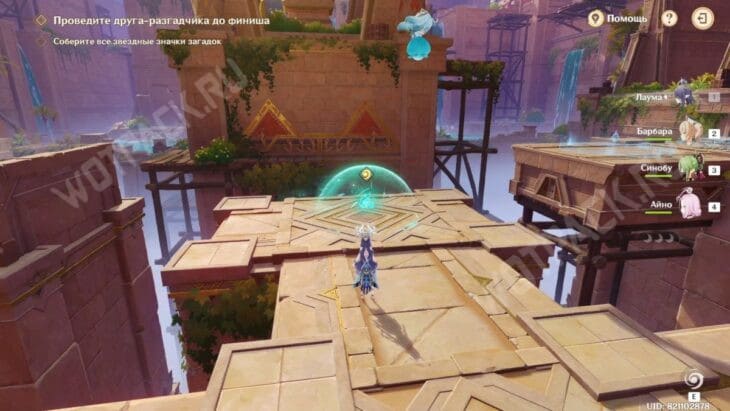 Взаимодействуйте с профессром Фарузан в деревне Аару для старта прохождения уровней с загадками.