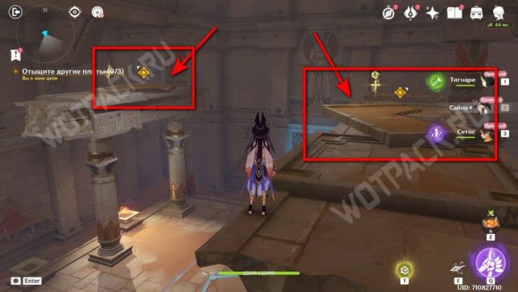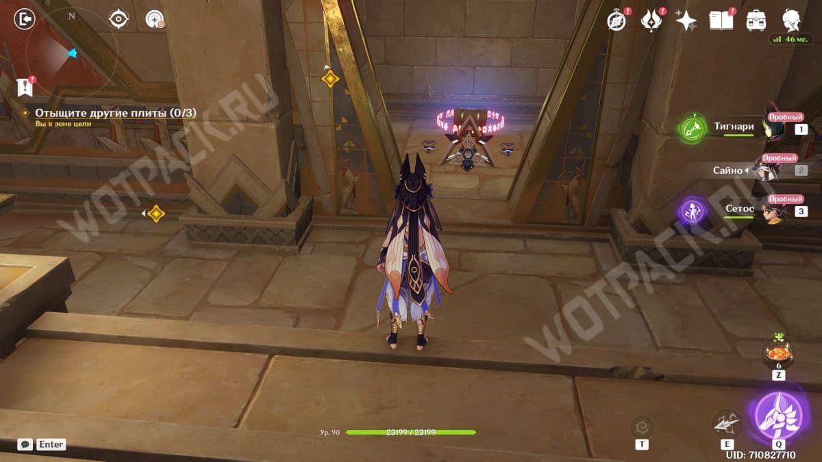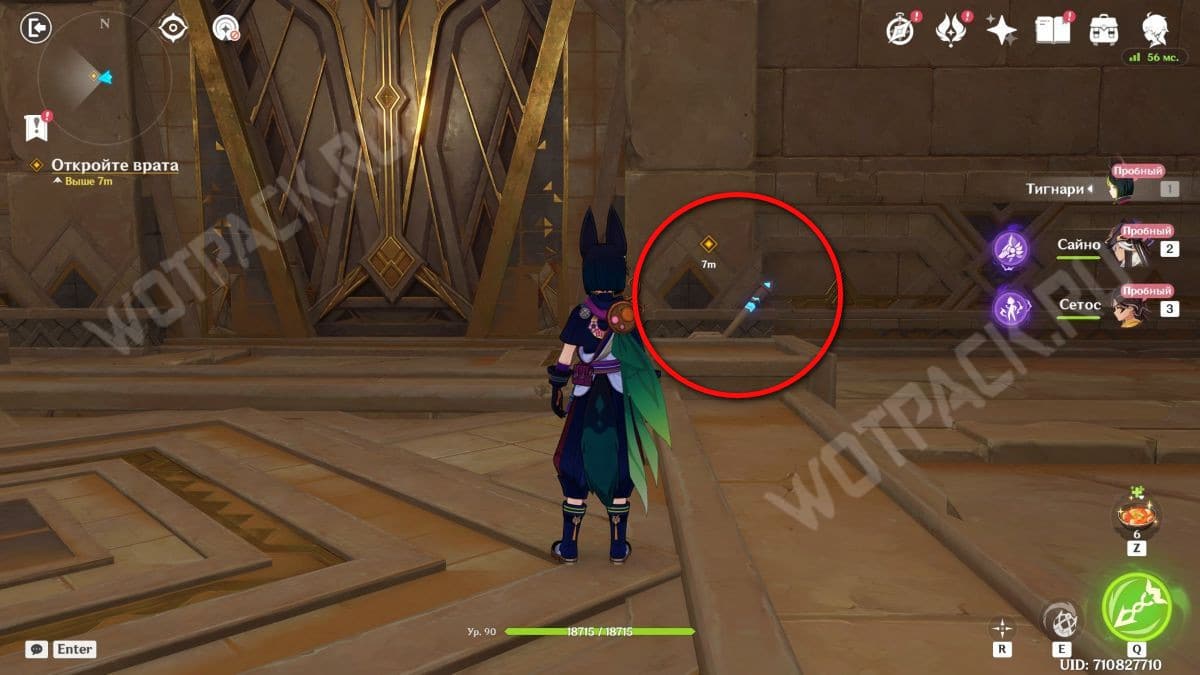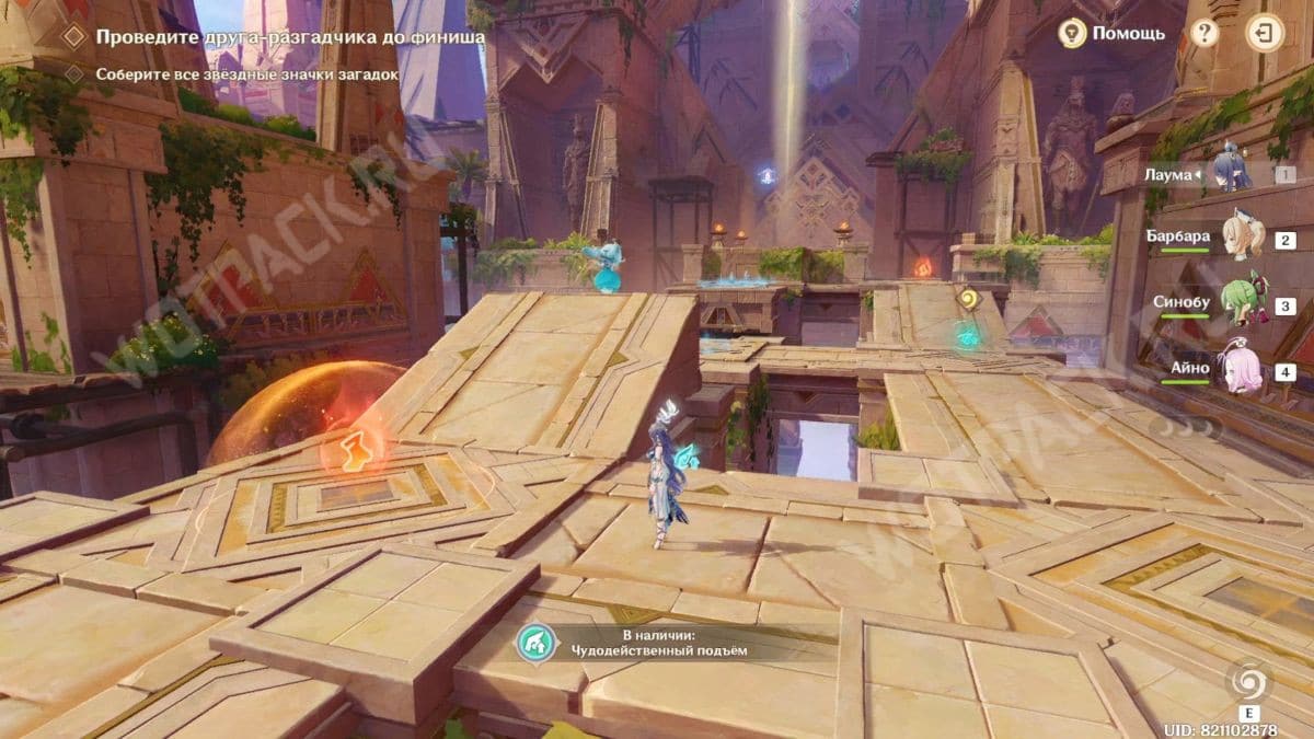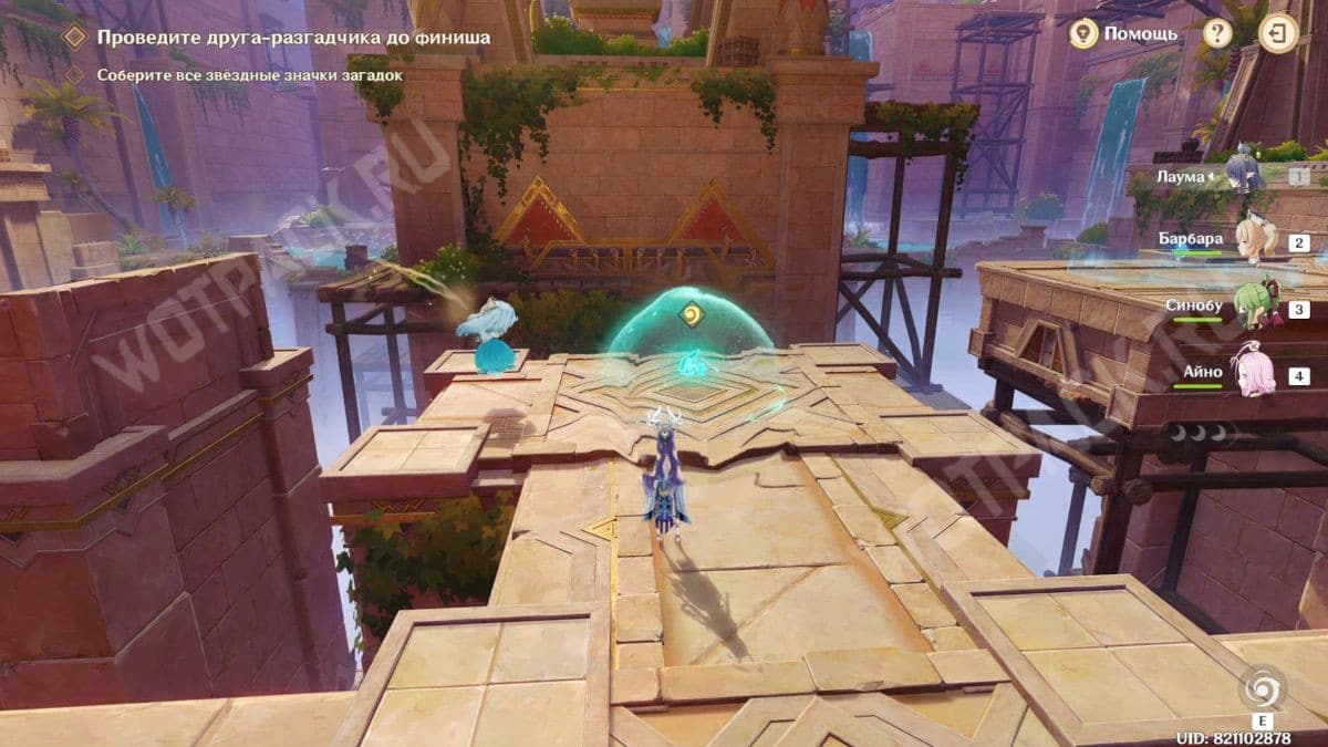 В следующей комнате окажется три закрытых двери, из-за чего придется разделиться. С группой Тигнари выберите правую дверь и откройте врата, потянув за рычаг. В следующем помещении потребуется дополнить мозаику.