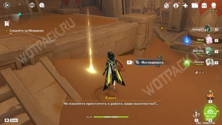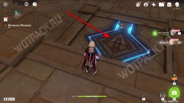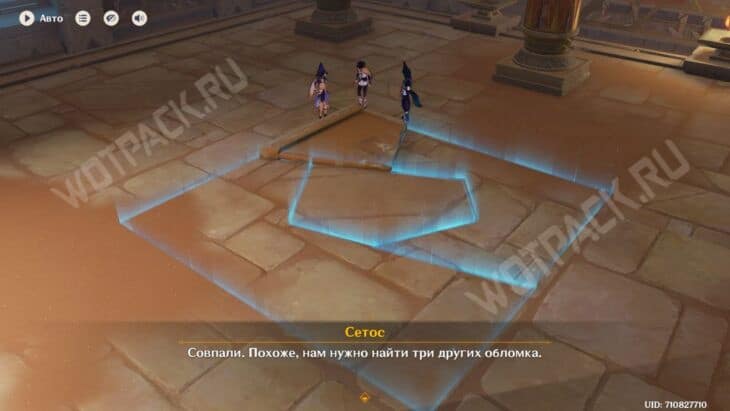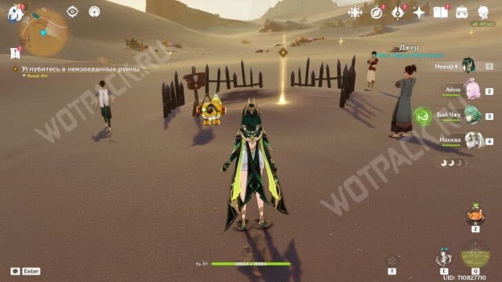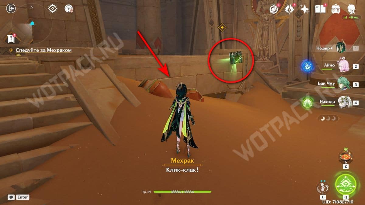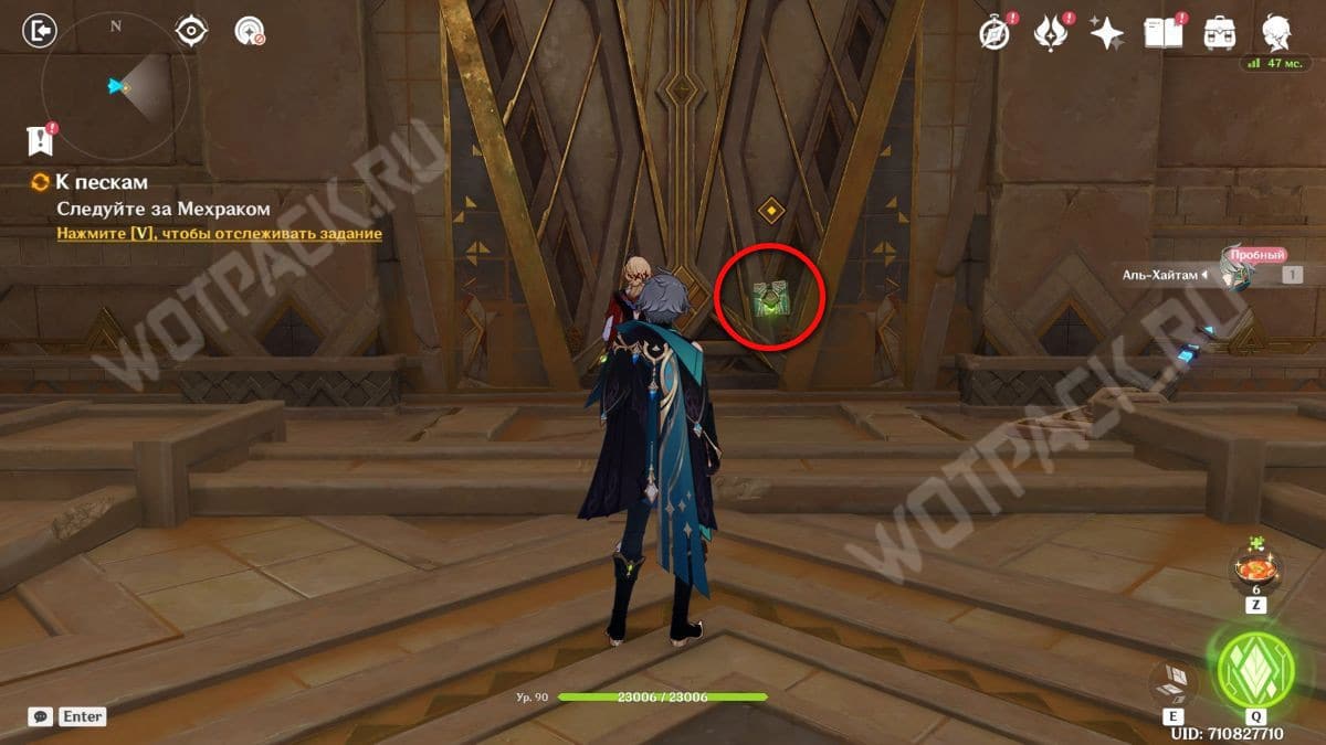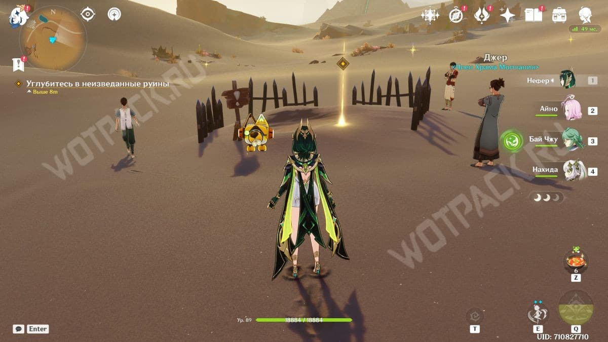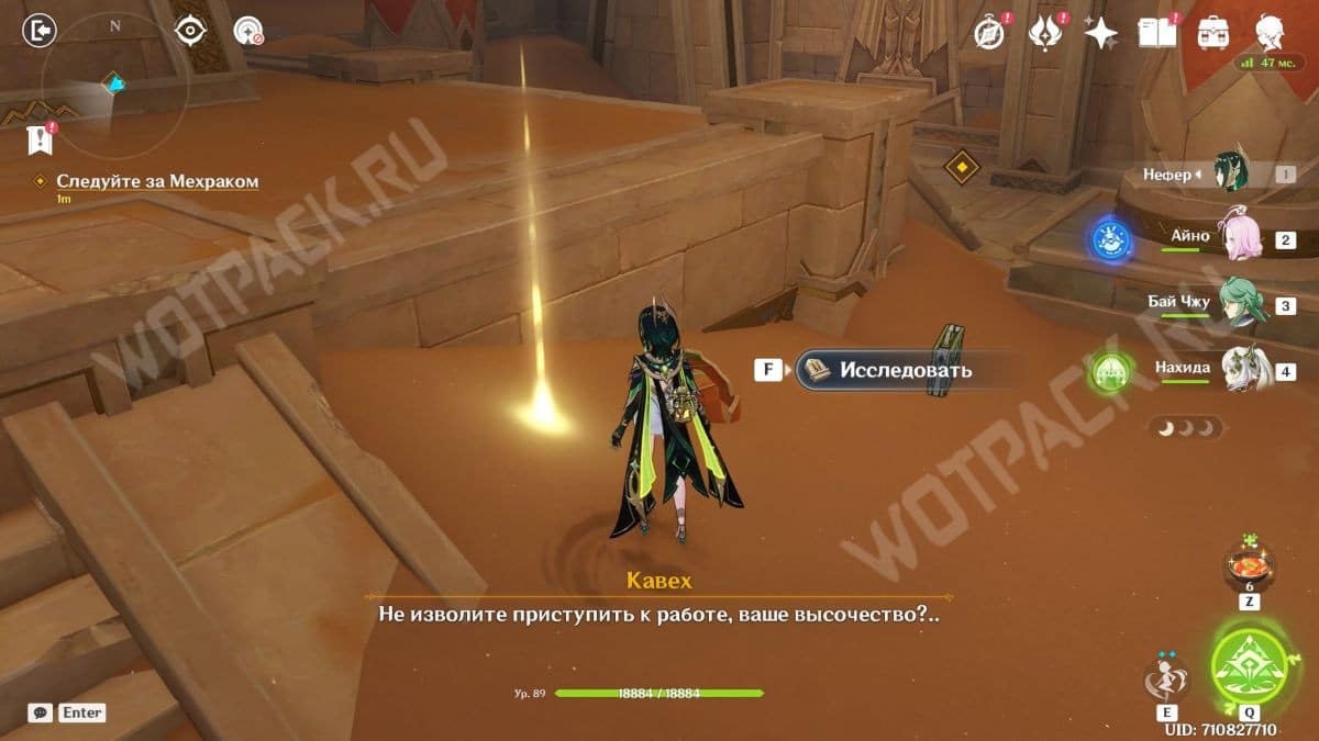 Перемотайте время и отправляйтесь на северо-запад пустыни Колоннад, где ожидают спутники. Немного позже к группе присоединятся Кавех и аль-Хайтам, после чего можно отправляться в дорогу. Углубитесь в неизведанные руины, взаимодействуя со светящейся меткой внутри огороженной забором области, что позволит попасть внутрь древних развалин.