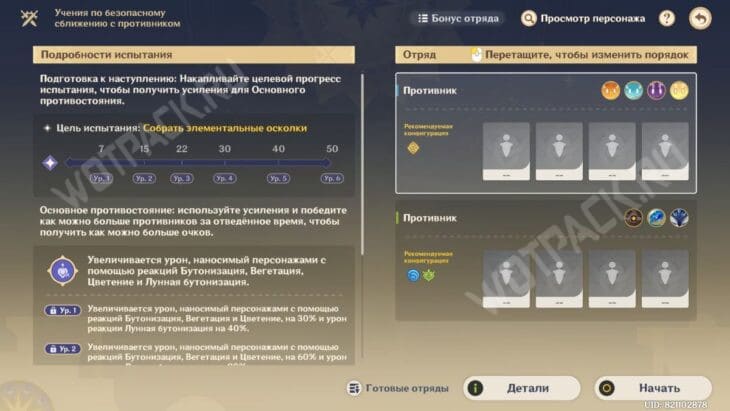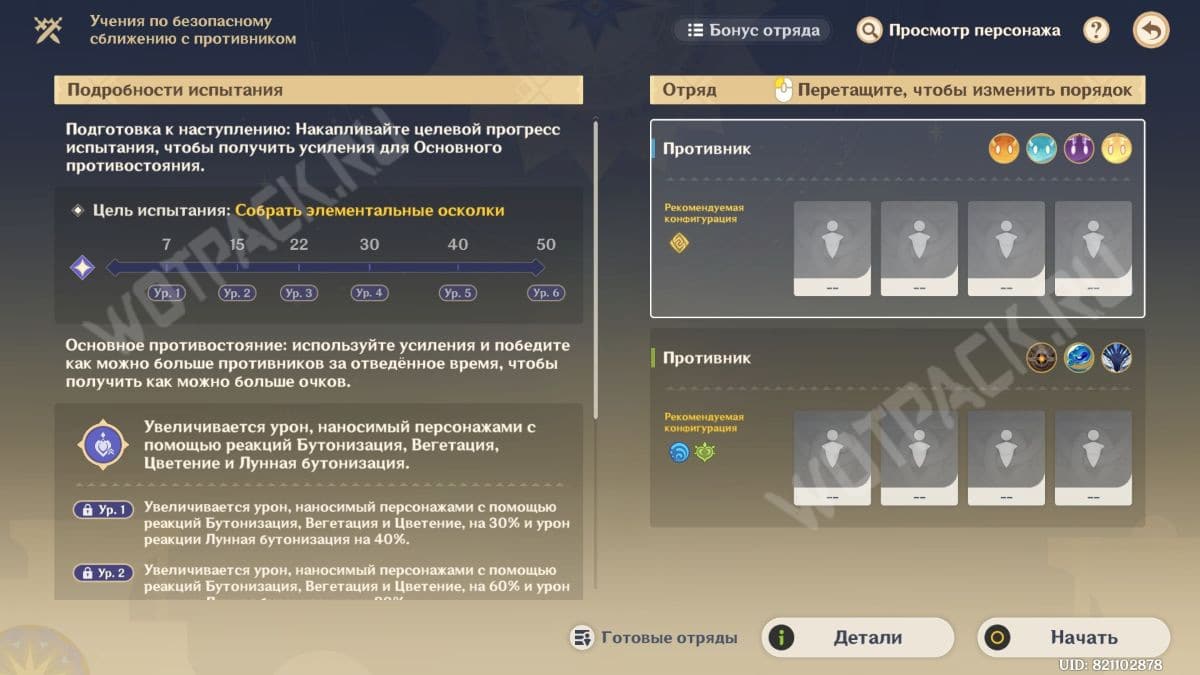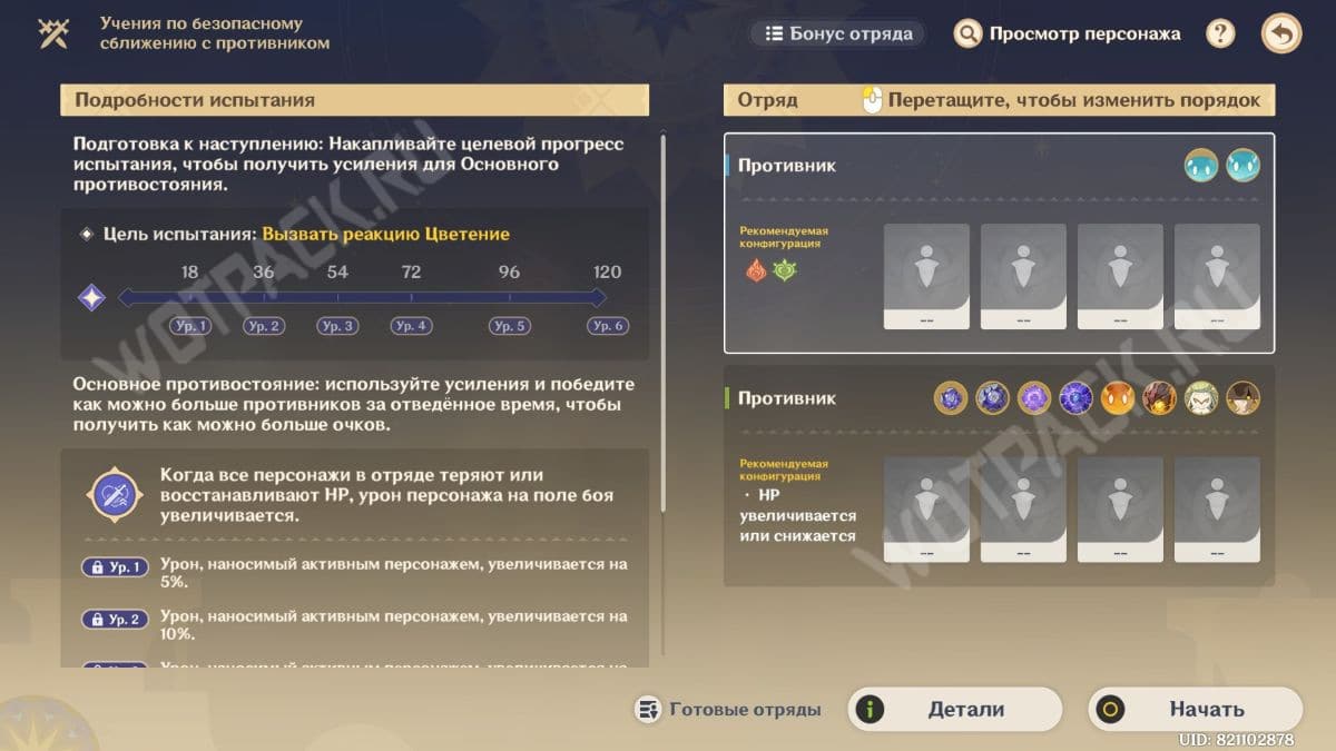 Основной целью испытания является вызов реакции Цветение, которую нужно создать 120 раз для максимального баффа. Поскольку враги имеют постоянную инфузию Гидро, в отряд, помимо пробной Нахиды, рекомендуется взять Пиро персонажей для постоянного вызова эффекта. Дендро Архонт при этом должна постоянно использовать свой навык и базовую атаку.