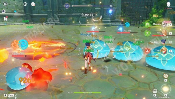Как только был набран бафф, откроется вторая часть уровня, в котором нужно использовать реакции с Дендро, включая оба вида Бутонизации, Цветение и Вегетацию.