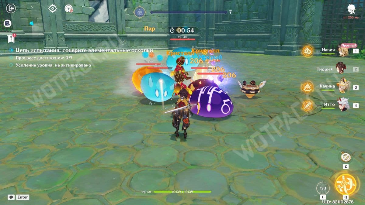 Враги полностью представляют собой слаймов разных стихий, из-за чего команду можно составить полностью из Гео персонажей. При этом старайтесь брать тех компаньонов, которые бьют из кармана, чтобы позволить пробной Навии по откату поглощать кристаллы. Всего осколки нужно собрать 50 раз.
