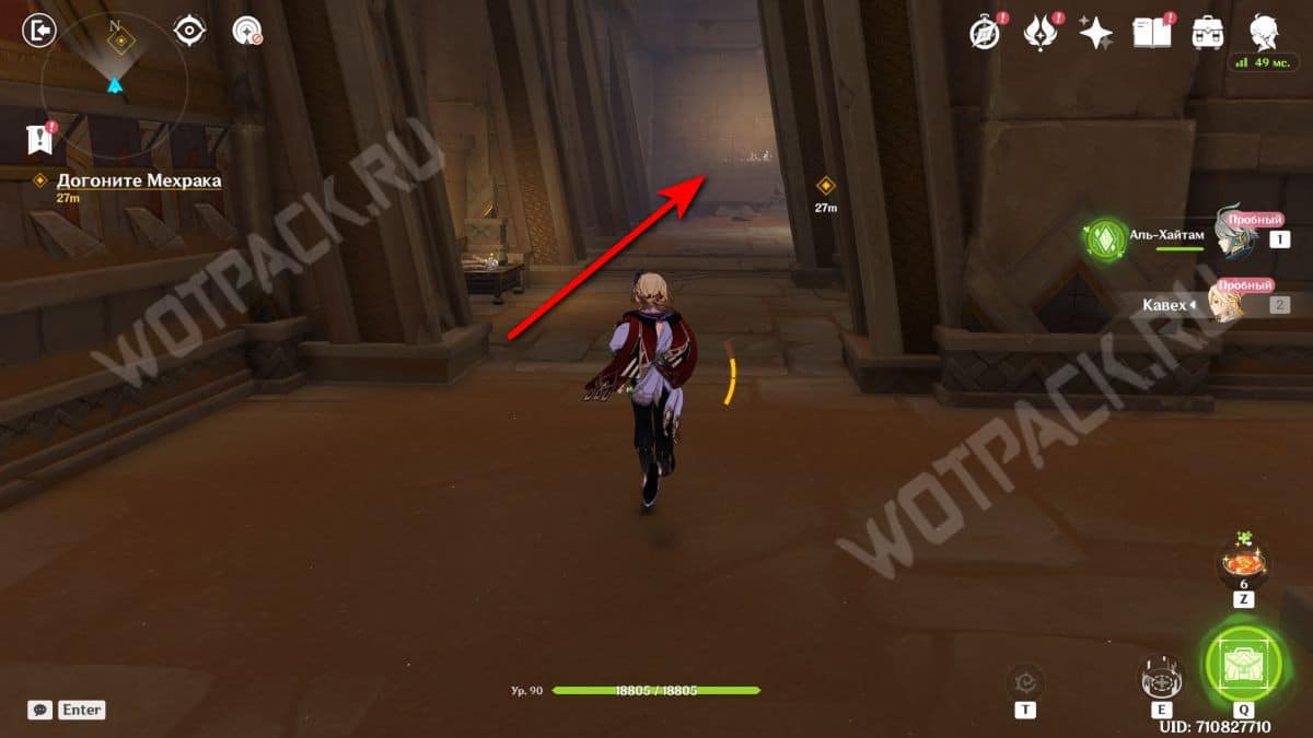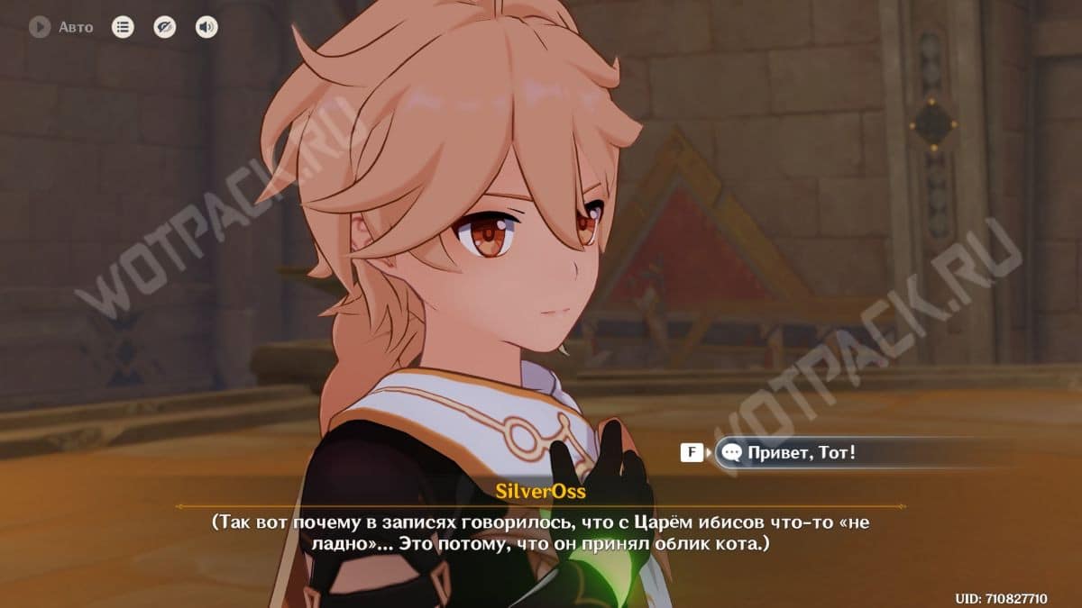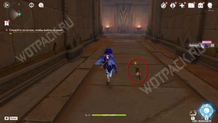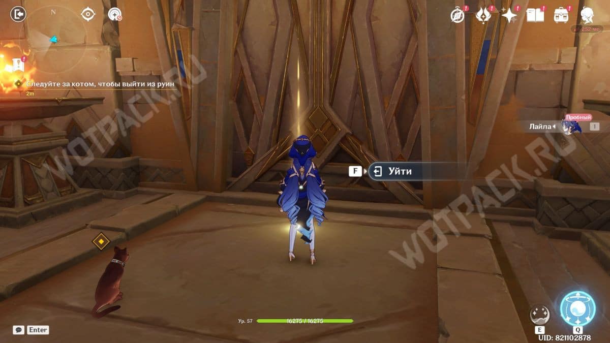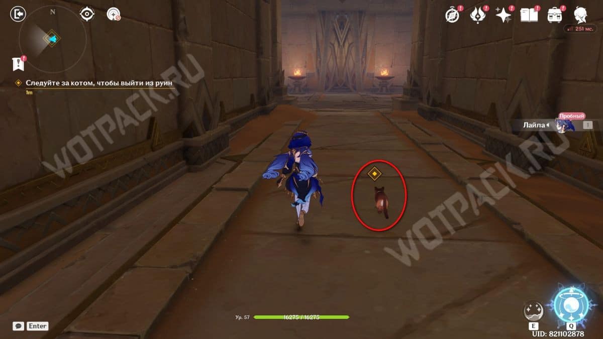 Как только мысли придут в порядок, впереди появится кот, готовый вывести девушку из храма. Следуйте за животным, отмеченным меткой, и покиньте помещение. Разговор с другой личностью студентки завершится появлением Кавеха и аль-Хайтама, которые предложат свою помощь.