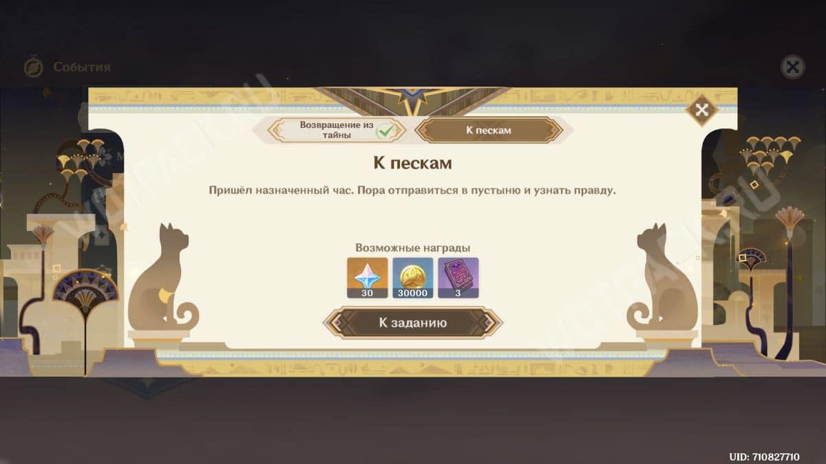 Сюжетная часть события состоит из двух частей, в ходе которых предстоит выяснить тайну загадочных руин под пустыней. Задания открываются с промежутком в день друг от друга.