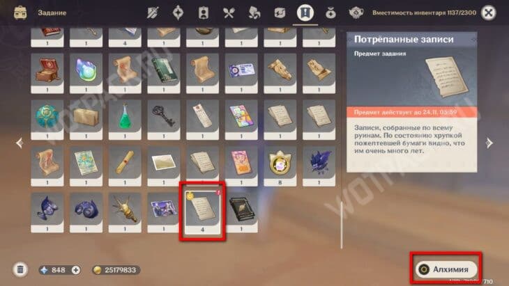 Приведите в порядок потрепанные записи в своем инвентаре в разделе «Задание». Для этого нажмите на кнопку «Алхимия», выбрав стопку листов.