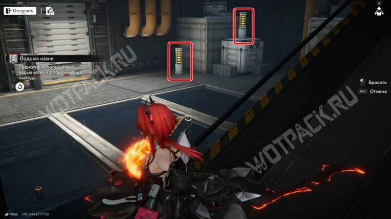 В следующем помещении сначала спуститесь вниз с помощью троса. Используйте цистерну в центре для производства взрывчатки и активируйте четыре цилиндра.