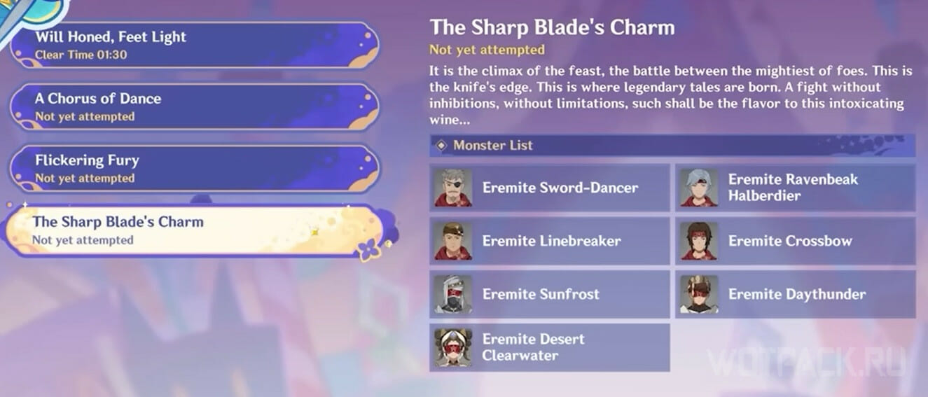 Также в испытании действует бафф «Отточенный фокус», бьющий врагов истинным уроном. Кроме того, урон заряженных атак повышается на 30%.