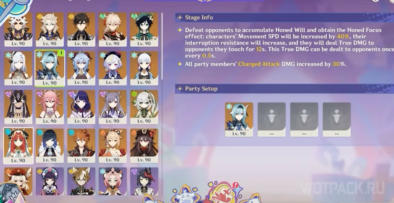 Далее выберите отряд для прохождения испытания. Исходя из баффа, в данном этапе лучше всего взять персонажей, которые часто используют заряженные атаки. Например, хорошо подойдут Ху Тао, Аяка, Гань Юй, Кэ Цин, аль-Хайтам, Тарталья, Странник, Кли и другие.