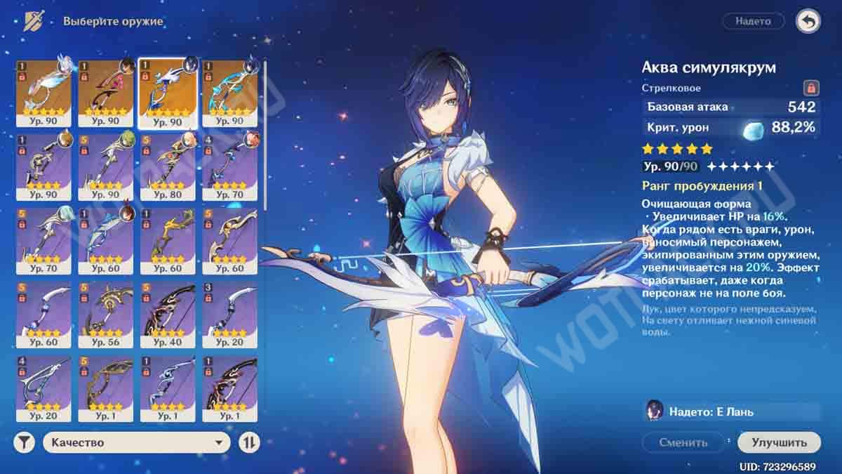 Большая часть представленного оружия на крит. урон, кроме Аквы симулякрум, может применяться только в качестве «затычки» со статами. Среди эпического снаряжения стоит выделить Церемониальный лук, позволяющей девушке на С0 играть как при открытом С1. Он значительно упрощает прохождение первой фазы испытания, делая лучницу более подвижной.
