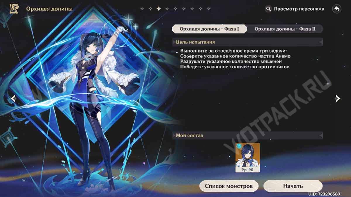 Для завершения испытания необходимо одолеть серьезного врага, полагаясь только на навыки девушки. Вокруг Орхидеи иногда появляются Пиро слаймы, которые при ликвидации дают энергию для взрыва стихии. Сломайте корни и венчик противника, чтобы тот оказался в уязвимом положении и понизил резисты к поступающему дамагу: