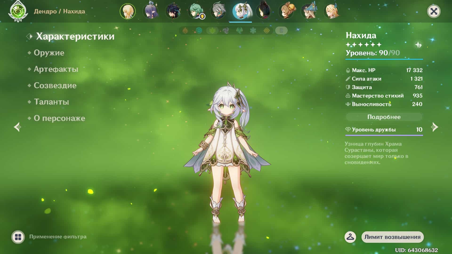 В выбранной разработчиками пачке героиня должна играть роль драйвера, поэтому добирать Нахиде обычно рекомендуемые 1000 ед. мастерства стихий не обязательно, лучше сделать упор в криты. Также обязательно собрать Архонта в сет Воспоминаний дремучего леса.